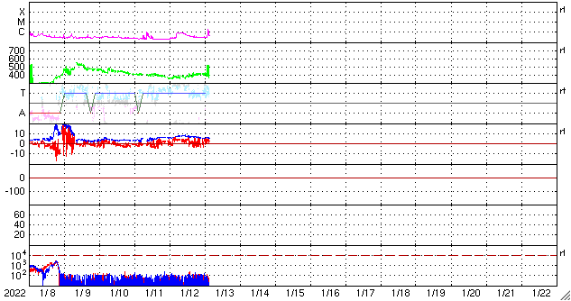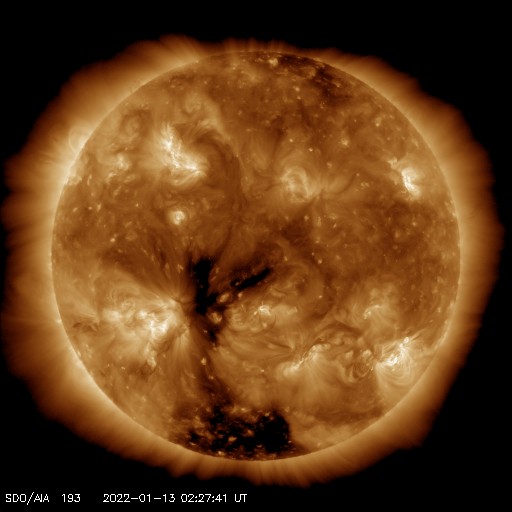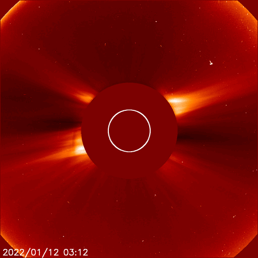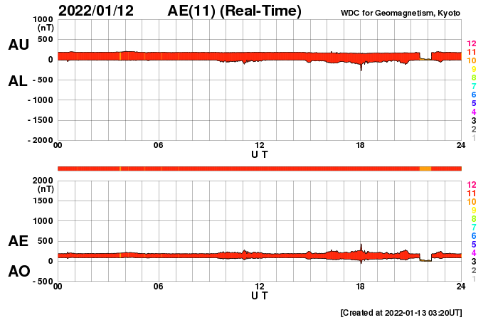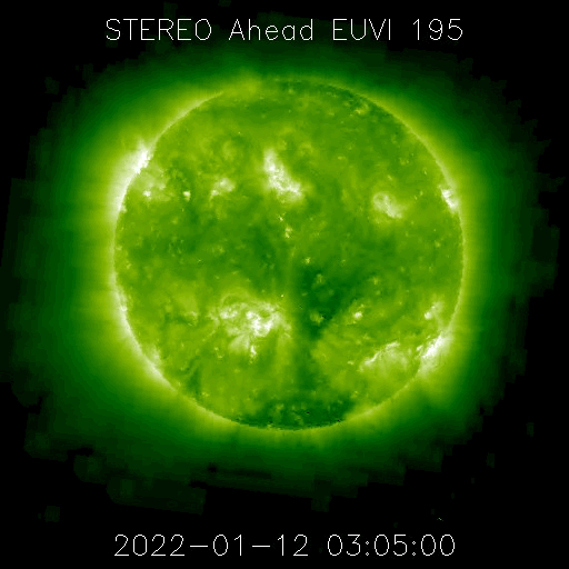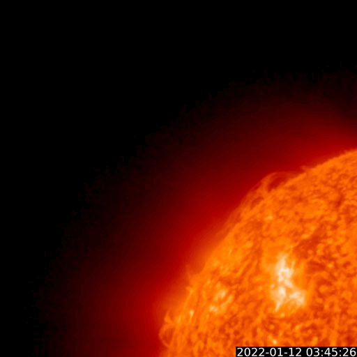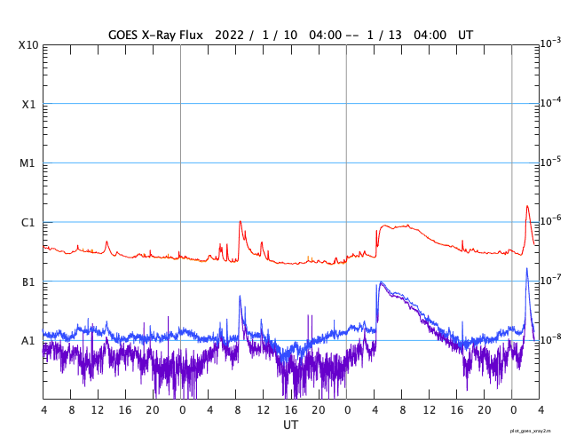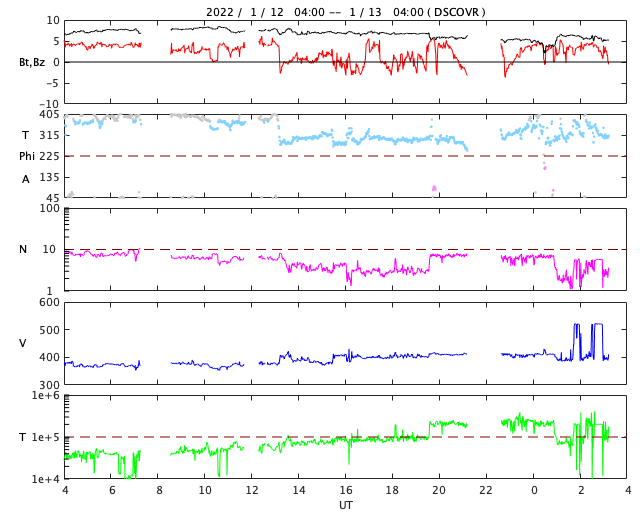 2022/ 1/13 12:27 更新 太陽の向こう側でフレアが発生し、CMEも飛び出しています。 担当 篠原 昨日のニュースの直後、 12日13時(世界時12日4時)頃に、 太陽の北東の端(左上)の向こう側で ある程度規模が大きいと思われるフレアが発生しています。 SDO衛星からは直接見えないので、 STEREO Ahead衛星のEUVI 195の動画を掲載します。 この写真でも、フレアは左上の端ぎりぎりで発生しています。 このフレアに伴って、コロナの激しい噴出が観測されています。 2枚目の動画は、GOES衛星SUVI 304です。 左上に向かってコロナのガスが大きく飛び出しています。 そして、SOHO衛星LASCO C2、C3でも CME(コロナ質量放出)の広がりが観測されています。 これによると、左上への噴出だけでなく、 下側へもより広い範囲に飛び出している様です。 フレアは太陽の向こう側で発生しているので、 地球への影響はありません。 この領域では、先ほど、13日11時(世界時13日2時)にも、 C1.9として観測されるフレアが発生しています。 この後、どの様な領域が現れるか注目して下さい。 太陽風は、370km/秒から410km/秒へ速度が少し上がり、 平均的な速さになっています。 磁場強度は、昨日のニュースの後に8nTへ少し強まりましたが、 半日ほどで下がって、現在は5nT前後と平均的です。 磁場の南北成分は、北寄りの傾向になっていて、 磁気圏は穏やかです。 AE指数は目立つ程の変化は見られません。 SDO衛星AIA193では、 南半球のコロナホールは、 右上の先頭部分が太陽の中心線に達しています。 このため、3日後くらいから太陽風の速度が高まるかもしれません。 南極付近の高緯度域の広がりからも影響が来るなら、 変化はより早く始まる可能性があります。