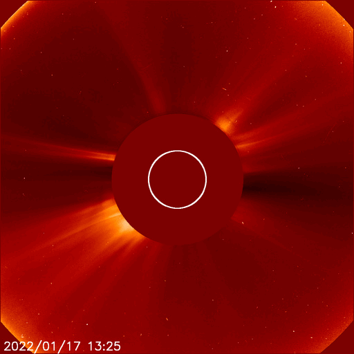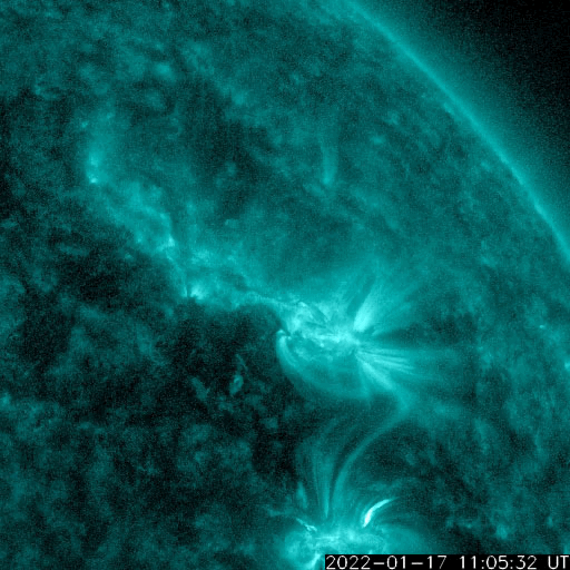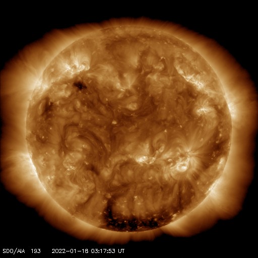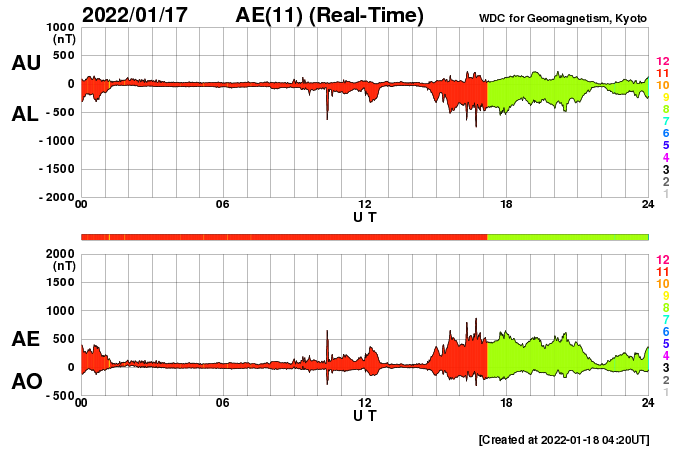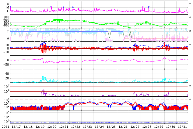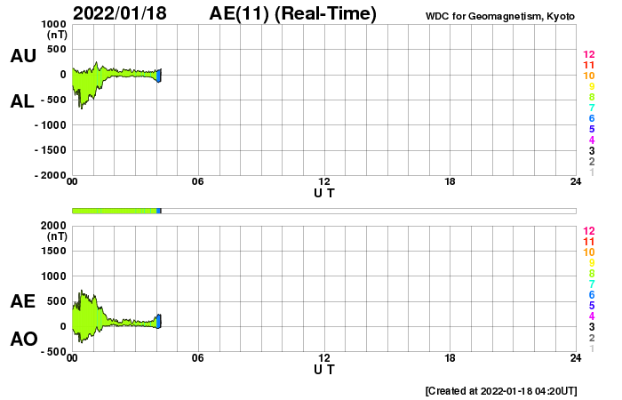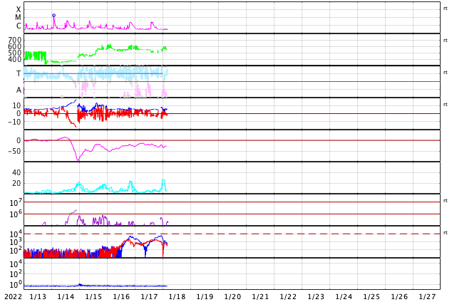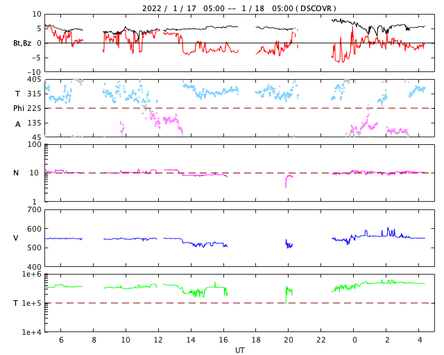 2022/ 1/18 13:40 更新 高速の太陽風が続き、磁気圏も活動的です。 担当 篠原 太陽風は、550km/秒から500km/秒へ少し下がり、 再び550km/秒に高まって、高速の状態が続いています。 高速風は4日目に入っています。 磁場強度は、5nT前後と平均的な状態です。 南北成分はグラフの中盤から南寄りになっています。 磁気圏の活動も高まっていて、 AE指数は途中から500nT程度の中規模の変化が続いています。 SDO衛星AIA193では、 コロナホールは西の端に近付いています。 太陽の中心部にコロナホールはなく、 この後、太陽風の速度は次第に下がっていくでしょう。 太陽は、北西(右上)の2930黒点群で、 C2.8、2.6、2.7と小規模フレアが昨夜遅くに3回発生しています。 SDO衛星AIA131の動画を掲載します。 このフレアに伴って、 CME(コロナ質量放出)が太陽の右上に向かって飛び出しています。 斜め方向なので、地球への影響はないでしょう。 X線グラフで目立つ変化はこのフレア程度です。 太陽は全体としては落ち着いた状態です。