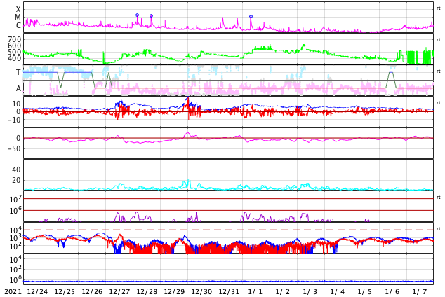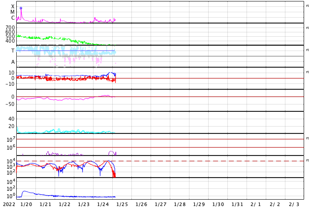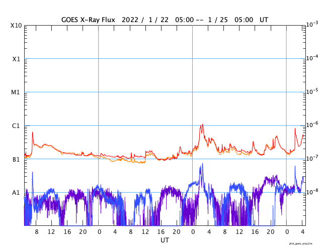 GOES衛星の太陽X線強度。赤・橙 = 0.1〜0.8 nm、青・紫 = 0.05〜0.4 nm (c) データ:NOAA/SWPC、作図:宇宙天気ニュース ![]() | ||||||||||||||||||||||||||||||||||||||||||||||||||||||||||||||||||||||||||||||||||||||||||||||||||||||||||||||||||||||||||||||||||||||||||||||||||||||||||||||||||||||||||||||||||||||||||||||||||||||||||||||||||