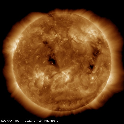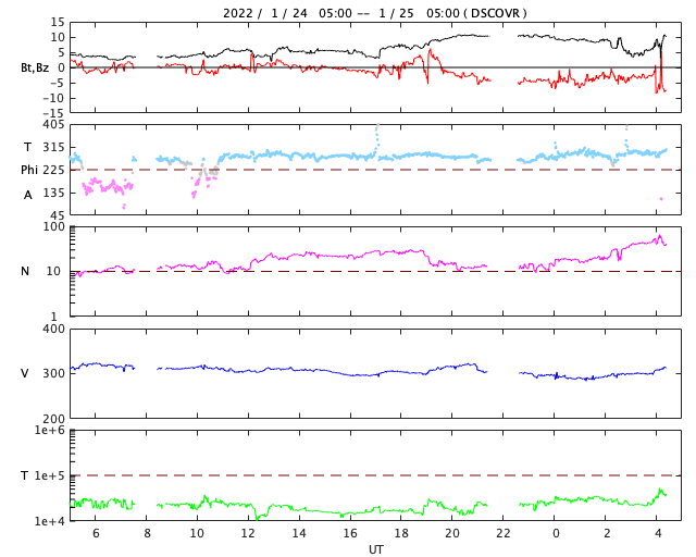 2022/ 1/25 13:34 更新 太陽風は低速の状態が続いています。新しい黒点が現れています。 担当 篠原 太陽風は300km/秒と低速の状態が続いています。 磁場強度は、5nTからグラフの中盤で10nTに強まりました。 CMEの影響が到来したのでしょうか。 グラフの最後で5nTに下がって、また10nTに上がっています。 磁場の南北成分は、 磁場が強まった頃から南向きに振れています。 しかし、速度が下がっているので影響は限定的で、 AE指数は200〜300nTの小規模の変化が しばらく続いた程度です。 SDO衛星AIA193では、 太陽の西側(右側)と中心部にコロナホールが見えています。 西に進んだ領域の影響は、この後見られるでしょうか。 また、3〜4日後に中心部の領域の影響が始まる可能性があります。 太陽は、北東の端(左上)から新しい黒点が現れ、 Bクラスの小さいフレアが続いています。 また、中心部の北側に2935黒点群が発生しています。 STEREO Ahead衛星によると、 次は南東の端(左下)から活動的な領域が現れそうです。 ![]() SDO衛星のAIA193カメラによる太陽コロナの様子 (c) SDO (NASA) ![]() SDO衛星による太陽の可視光写真。マウスの矢印を写真に重ねると、黒点番号付きの写真に切り替わります。 (c) SDO (NASA) ![]() DSCOVRが観測した太陽風の磁場(黒線は全体の強度、赤線は南北成分) 磁場の向き、プラズマの密度、速度、温度 (c) データ:NOAA/SWPC、作図:宇宙天気ニュース ![]() AE指数(速報値) 下段のAEグラフの値が高くなると、オーロラ活動が活発化しています。 (c) 京都大学WDC ![]() ![]() 27日の太陽周期に合わせた図 太陽が同じ面を地球に向けていた27日前の変化から、今後を予想することができます。 (c) 作図:宇宙天気ニュース