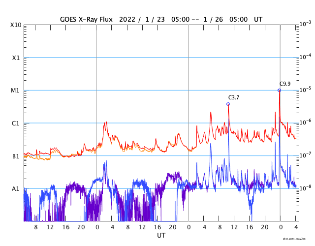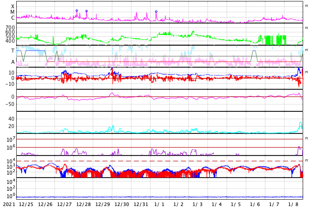 GOES衛星の太陽X線強度。赤・橙 = 0.1〜0.8 nm、青・紫 = 0.05〜0.4 nm (c) データ:NOAA/SWPC、作図:宇宙天気ニュース ![]() | ||||||||||||||||||||||||||||||||||||||||||||||||||||||||||||||||||||||||||||||||||||||||||||||||||||||||||||||||||||||||||||||||||||||||||||||||||||||||||||||||||||||||||||||||||||||||||||||||||||||||||||||||||||||||||||||||||
