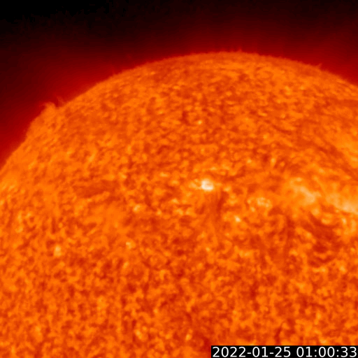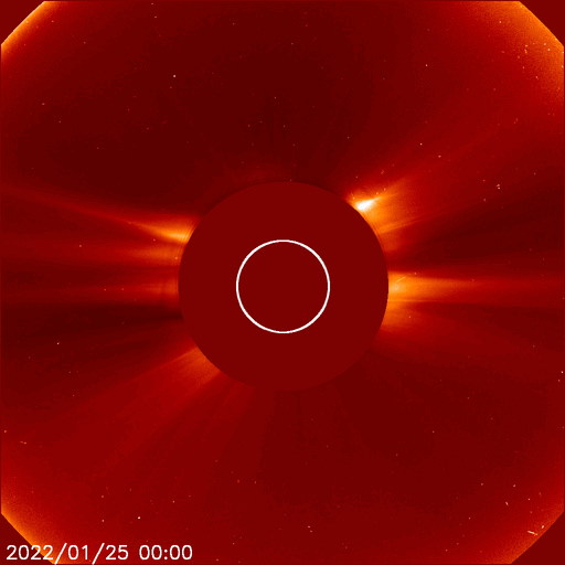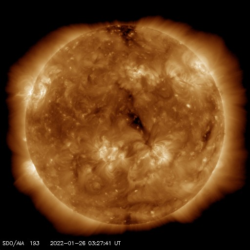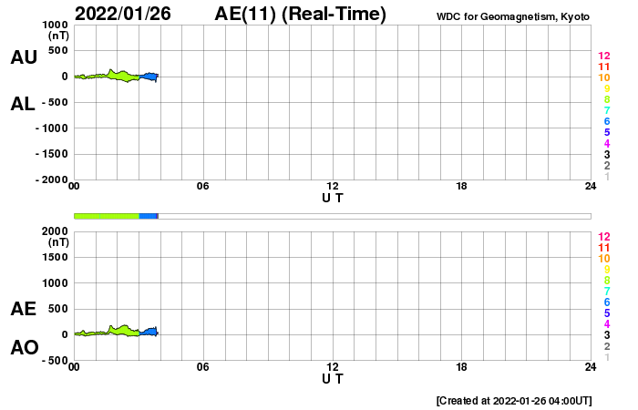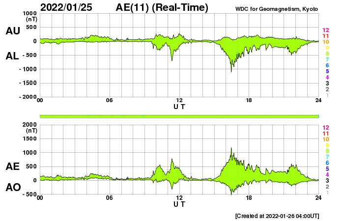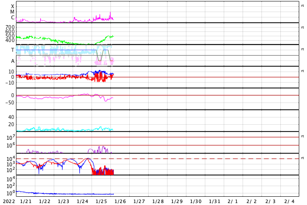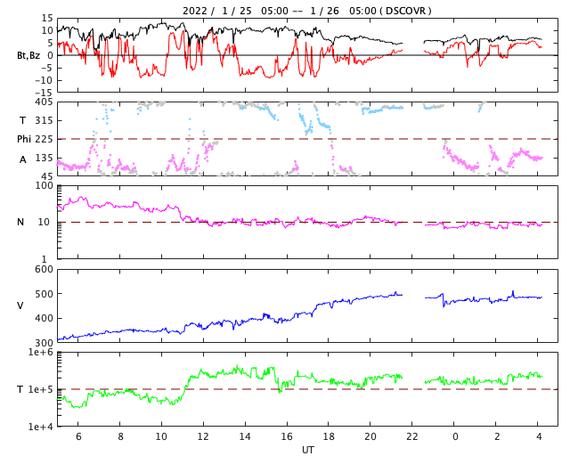 2022/ 1/26 13:24 更新 太陽風の速度はやや高速になり、磁気圏の活動も強まりました。 担当 篠原 コロナホールの影響がやって来た様です。 太陽風は、昨夜から速度が高まり始め、 昨日のニュースの頃は300km/秒と低速でしたが、 今朝早くには480km/秒とやや高速の状態になり、 現在までこの状態が続いています。 太陽風の磁場強度は、 速度が高まる頃は10nTに強まっていましたが、 現在は5〜7nTと平均的な状態に近付いています。 磁場の南北成分は、グラフの前半で南向きに強まり、 -8nT前後の変化が発生しました。 このため、磁気圏の活動も強まって、 AE指数は500〜1000nTの中規模の活動が続きました。 現在の磁場は北寄りに傾向が変わっていて、 AE指数は変化が小さくなっています。 SDO衛星AIA193では、 西に進んだコロナホールは太陽の端に近付き、 次のコロナホールは中心線を越えるくらいです。 高速太陽風は比較的短い時間で一旦落ち着き、 3日後くらいから次の領域の影響が始まりそうです。 昨日の昼前、25日11時(世界時25日2時)に、 太陽の中心部の北側で、フィラメント噴出が発生しました。 GOES衛星SUVI 304の動画を掲載します。 やや分かりにくいですが、 薄暗く見えるダークフィラメントが 左上に向かって飛び出す様子が見えています。 (全球の動画では、右端でプロミネンスの噴出も見えています) SOHO衛星LASCO C2、C3によると、 淡いCME(コロナ質量放出)が太陽の上に向かって発生しています。 発生地点が太陽の中心に近いことから、 噴出は地球にも向かっている可能性があります。 2〜3日後の太陽風に磁場の強まりなどの影響が見られるかもしれません。 上で書いた様に、コロナホールの変化もその頃に到来しそうなので、 混ざることになるのかもしれません。 太陽は、北東の端から現れた黒点に2936群と番号が付けられています。 現在の写真では、その左側に次の黒点が見え始めています。 この領域で、今朝、26日8時半(世界時25日23時半)に、 C9.9とMクラスにとても近い小規模フレアが発生しました。 今後の活動に注目して下さい。 また、中心部の南側にも新しい黒点が現れています。