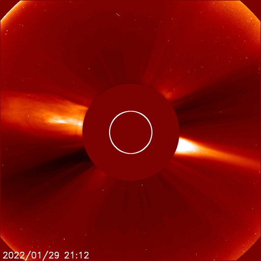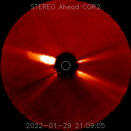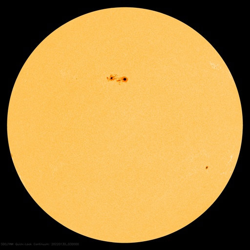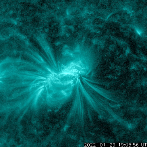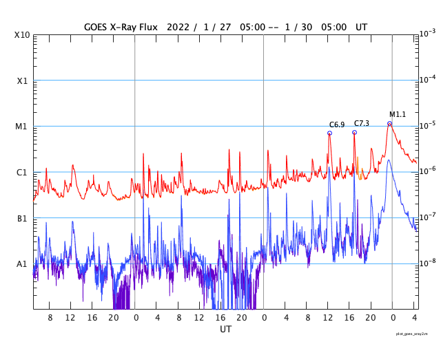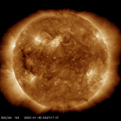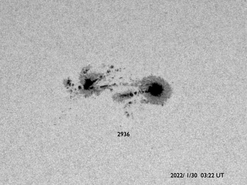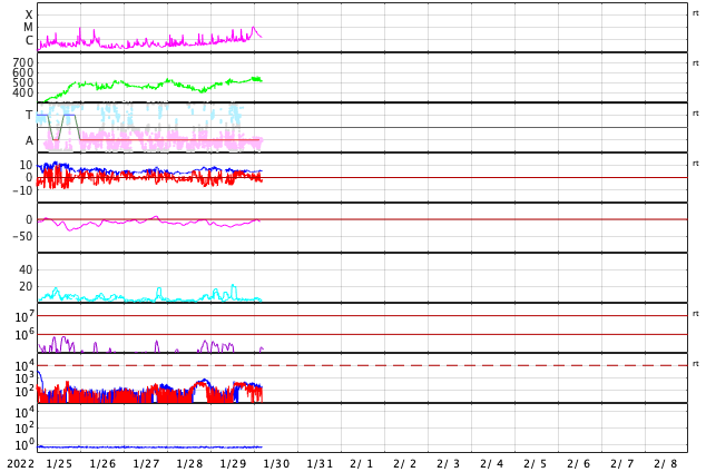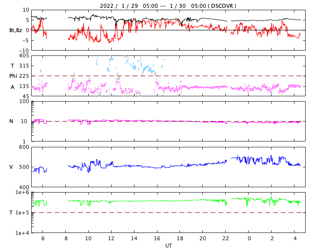 2022/ 1/30 13:46 更新 M1.1の中規模フレアが発生し、CMEによる太陽風の乱れが地球に向かっています。 担当 篠原 太陽の中心部北側の2936黒点群で、 今朝、30日7時半(世界時29日22時半)に M1.1の中規模フレアが発生しました。 SDO衛星AIA131と193による動画を掲載します。 AIA193(茶色)の動画では、 コロナの爆発が太陽全体に広がる様子も見えています。 SOHO衛星LASCO C2やSTEREO Ahead衛星COR2を見ると、 太陽を囲むように白いガスが広がって見える ハロー型のCME(コロナ質量放出)となっています。 このため、噴出は地球へも向かっていると考えられます。 到来まで3日程度と考えると、2月2日頃になりそうです。 太陽風の乱れと磁気圏活動の高まりに注目して下さい。 現在の2936黒点群をSDO衛星の可視光写真で紹介します。 昨日と同じくらいの大きな姿を保っています。 太陽では、南東の端(左下)から新しい黒点が現れています。 この領域がまだ太陽の向こう側だった 今日未明、30日2時(世界時29日17時)に C7.3とやや大きい小規模フレアと、 その後にC3.3の小規模フレアを起こしています。 どの様な活動を起こすのか、こちらにも注目して下さい。 太陽風は、昨日のニュースの後に速度が500km/秒に上がり、 グラフの後半はデータが乱れていて値がはっきりしませんが、 500km/秒台前半で推移している様です。 磁場強度は、5nTと平均的な状態です。 磁場の南北成分は、南寄りから北寄りに変わり、 グラフの最後は0nT付近と変化しています。 このため、AE指数も前半に1300nTに達する 大きな変化が発生していますが、 以降は変化がなくなり、穏やかになっています。 高速風は続いているので、磁場が再び南寄りになれば、 磁気圏の活動も高まるでしょう。 SDO衛星AIA193では、 太陽の中心部にコロナホールはなく、 CMEの乱れが到来するまでは、 太陽風は次第に穏やかになりそうです。 ![]() 2936黒点群で発生したM1.1の中規模フレア。SDO衛星AIA131、193。 (c) SDO (NASA)、(動画加工 : 宇宙天気ニュース) ![]() SOHO衛星LASCO C2によるCME。太陽を囲むようにガスが飛び出している。 (c) SOHO (ESA & NASA)、 (動画加工 : 宇宙天気ニュース) ![]() 太陽を左斜めから観測しているSTEREO Ahead衛星によるCME。 (c) STEREO (NASA)、 (動画加工 : 宇宙天気ニュース) ![]() 2936黒点群の拡大写真。SDO衛星。 (c) SDO (NASA)、作図:宇宙天気ニュース ![]() SDO衛星のAIA193カメラによる太陽コロナの様子 (c) SDO (NASA) ![]() SDO衛星による太陽の可視光写真。マウスの矢印を写真に重ねると、黒点番号付きの写真に切り替わります。 (c) SDO (NASA) ![]() GOES衛星の太陽X線強度。赤・橙 = 0.1〜0.8 nm、青・紫 = 0.05〜0.4 nm (c) データ:NOAA/SWPC、作図:宇宙天気ニュース ![]() DSCOVRが観測した太陽風の磁場(黒線は全体の強度、赤線は南北成分) 磁場の向き、プラズマの密度、速度、温度 (c) データ:NOAA/SWPC、作図:宇宙天気ニュース ![]() AE指数(速報値) 下段のAEグラフの値が高くなると、オーロラ活動が活発化しています。 (c) 京都大学WDC ![]() ![]() 27日の太陽周期に合わせた図 太陽が同じ面を地球に向けていた27日前の変化から、今後を予想することができます。 (c) 作図:宇宙天気ニュース