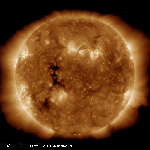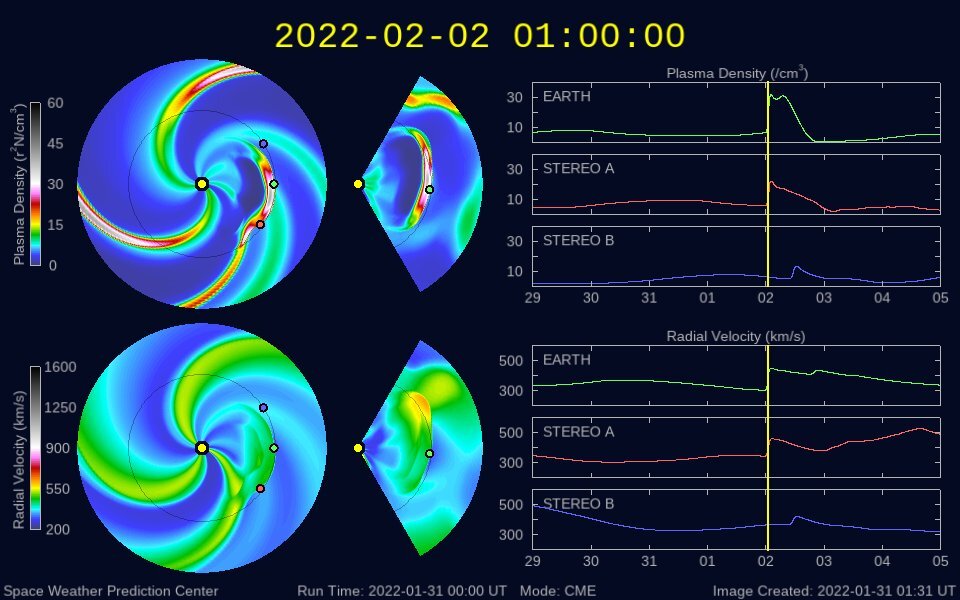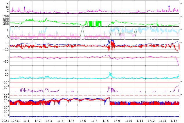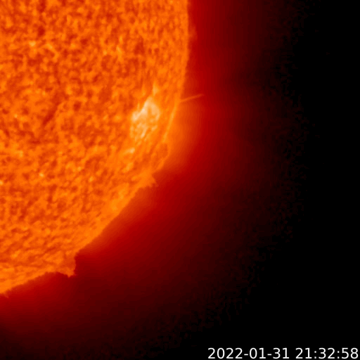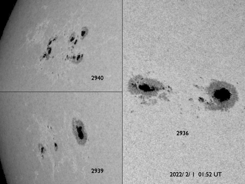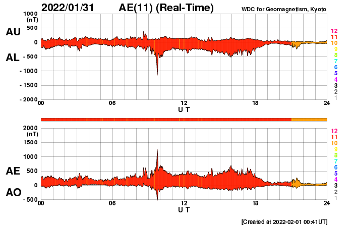 2022/ 2/ 1 12:28 更新 Cクラスの小規模フレアが続いています。CMEによる太陽風の乱れが近付いています。 担当 篠原 太陽の南西の端(右下)で、 今朝、1日8時(世界時1月31日23時)に プロミネンス噴出が発生しました。 GOES衛星SUVI 304の動画を掲載します。 なかなか見事な噴出です。 CME(コロナ質量放出)も発生している可能性がありますが (SOHO衛星やSTEREO Ahead衛星の画像がまだありません)、 地球に対して横方向の現象なので影響はないでしょう。 太陽は、北東(左上)の2940黒点群で、 C1の小規模フレアが7回程度発生しています。 中心付近の2936群や南東(左下)の2939群でも 小さい活動が続いています。 この3つの黒点群の拡大写真を2枚目に掲載しています。 この後の活動に注目して下さい。 太陽風は昨夜から速度が下がり始め、 現在は420km/秒と平均的な速度に戻っています。 磁場強度は、5〜6nTと平均的な状態が続いています。 磁場の南北成分は、南向きの変化が昨日で終わり、 以降はやや北寄りになっています。 磁気圏の活動も、 AE指数のグラフの途中までは500nTの変化が続いていますが、 以降は変化がなくなっています。 NOAA/SWPCの太陽風予報によると、 30日に発生したCMEによる太陽風の乱れは、 明日、2日10時(世界時2日1時)頃に地球に到来する可能性があります。 3枚目に予想図を掲載します。 この予報では、 速度の高まりは450km/秒程度と大きくはありません。 しかし、磁場の強まりが到来して、南向きに大きく変化すると、 オーロラの活動は一気に強まります。 これから明日にかけて注目して下さい。