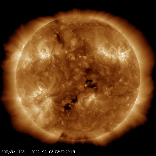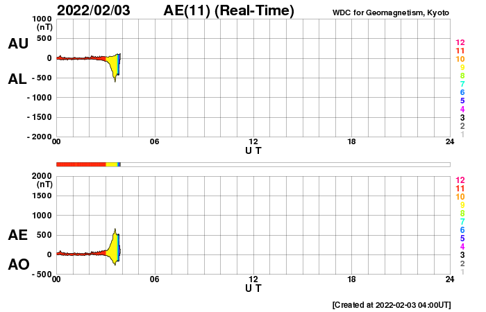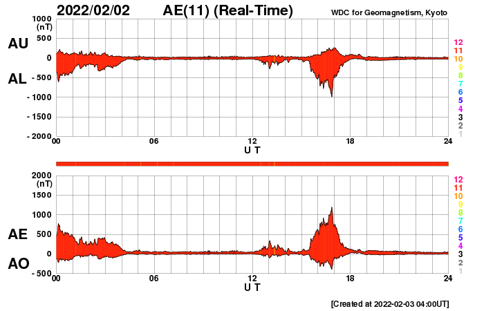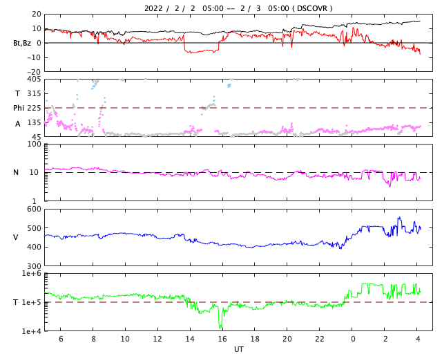 2022/ 2/ 3 13:21 更新 太陽風が高速になっています。磁気圏の活動も高まりそうです。 担当 篠原 太陽風は、昨日のニュースの後はゆっくりと速度が下がり、 今日の未明には400km/秒と平均的な速さに戻りました。 一方、磁場強度は7nT前後とやや強まった状態が続き、 今朝、3日5時(世界時2日20時)には10nTへ強まり、 以降も上がり続けて、現在は15nTに達しています。 それに続く様に速度も上昇を始め、 3日10時(世界時3日1時)には500km/秒に達して 高速の風に変わっています。 以降も500km/秒前後を推移しています。 SDO衛星AIA193の中心部に見えていた コロナホールの影響が早めに始まったのでしょうか。 高速風の噴き出し口は、 もっと右側へ広がっていたのかもしれません。 太陽風磁場の南北成分は、 グラフの中盤で一時的に南向きに変化していますが、 その他は北向きの時間が続き、 グラフの最後で南へ変化しているところです。 このため、磁気圏の活動は磁場が南を向いた時間帯に AE指数で1000nTに達する大きな変化が発生していますが、 その前後は穏やかです。 そして、グラフの最後で変化が始まっているところです。 このまま磁場が南向きに変化を続ける様であれば、 オーロラの活動も高まって行くでしょう。 太陽は、北東(左上)の2940黒点群でC5.5、 南東(左下)の2939黒点群でC7.8を最大に、 C1〜3の小規模フレアが多数発生しています。 北東の端からは新しい黒点がちょうど顔を出しています。 こちらに現れる前にC2.0の小規模フレアを起こしていて、 どのくらいの活動度の領域か注目して下さい。 ![]() SDO衛星のAIA193カメラによる太陽コロナの様子 (c) SDO (NASA) ![]() SDO衛星による太陽の可視光写真。マウスの矢印を写真に重ねると、黒点番号付きの写真に切り替わります。 (c) SDO (NASA) ![]() DSCOVRが観測した太陽風の磁場(黒線は全体の強度、赤線は南北成分) 磁場の向き、プラズマの密度、速度、温度 (c) データ:NOAA/SWPC、作図:宇宙天気ニュース ![]() AE指数(速報値) 下段のAEグラフの値が高くなると、オーロラ活動が活発化しています。 (c) 京都大学WDC ![]() ![]() 27日の太陽周期に合わせた図 太陽が同じ面を地球に向けていた27日前の変化から、今後を予想することができます。 (c) 作図:宇宙天気ニュース