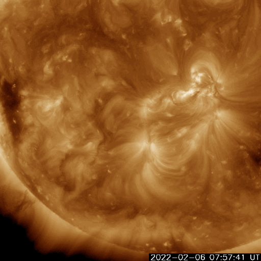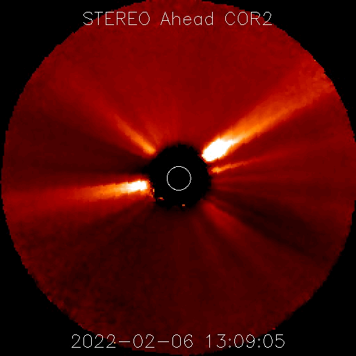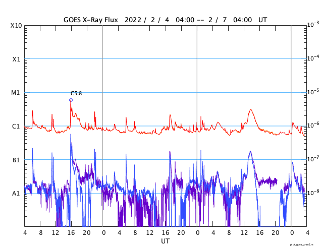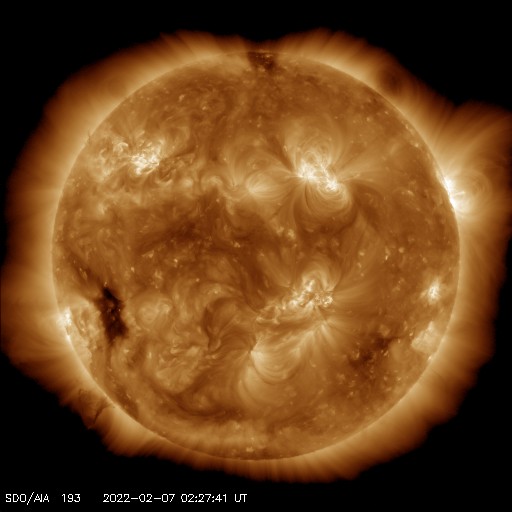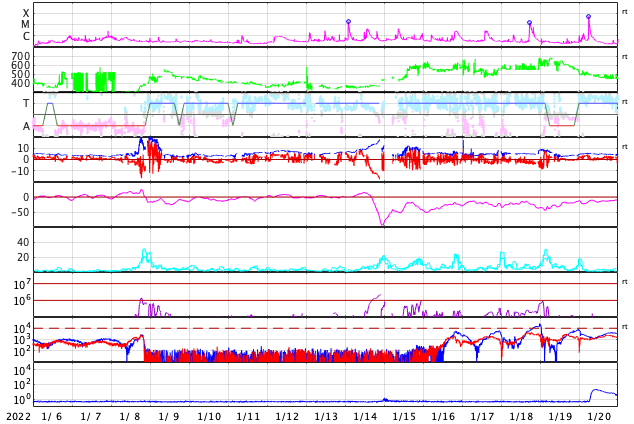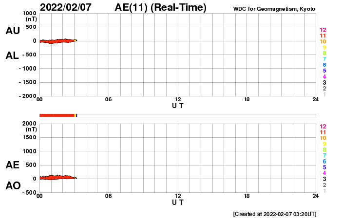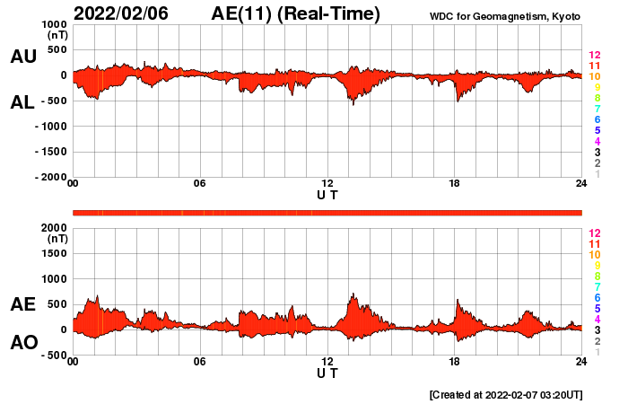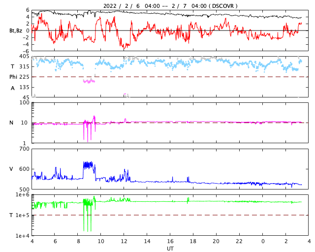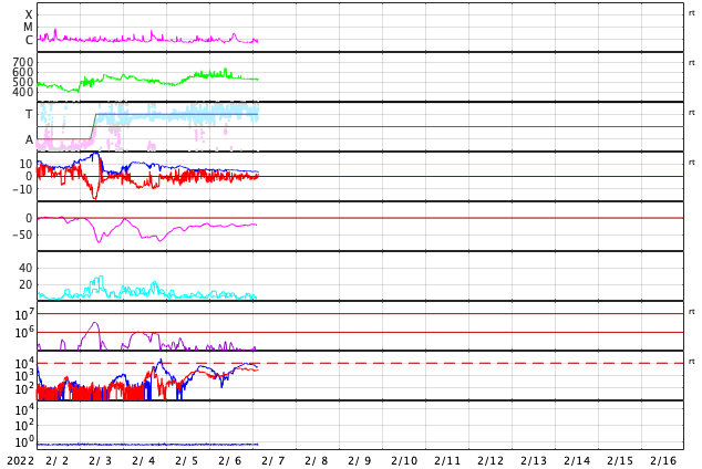 2022/ 2/ 7 12:35 更新 フィラメント噴出が発生し、CMEが地球に向かっています。高速の太陽風が続いています。 担当 篠原 太陽の南東側(左下)と中心付近で フィラメント噴出が発生しています。 SDO衛星AIA193、304による動画を掲載します。 1つめは、6日18時(世界時6日9時)に発生して、 太陽の左下に向かってガスが飛び出しています。 そして、6日21時(世界時6日12時)には、 中心付近から太陽全体に重なるように ガスが広がっていく様子が見えます。 STEREO Ahead衛星COR2によると、 CME(コロナ質量放出)が発生しています。 2つめのフィラメント噴出によるCMEは、 地球の方向へもガスが飛び出していると考えられます。 到来まで3〜4日程度と考えると、 9日の夜から11日にかけて太陽風の変化に注目して下さい。 磁場の強まりが到来して、南向きに変化すると、 オーロラの活動を強める可能性があります。 X線グラフは、2つめのフィラメント噴出の時に、 C3.1に達するゆっくりした強まりが発生していますが、 その他は目立った変化はありません。 太陽風の速度は、 550km/秒から530km/秒へゆっくりと下がっていますが、 高速の状態が続いています。 磁場強度は、6nTから4nTへ少し下がっている様です。 こちらは平均的な状態です。 磁場の南北成分は、弱い南寄りになっています。 磁気圏では小中規模の活動が続いていて、 AE指数は300〜600nTの変化が繰り返し発生しています。 SDO衛星AIA193を見ると、 南東(左下)のコロナホールがよく見えるようになってきました。 STEREO Ahead衛星によると南北への広がりもある様で、 この後、どの様な姿が見えるようになるか注目して下さい。