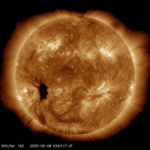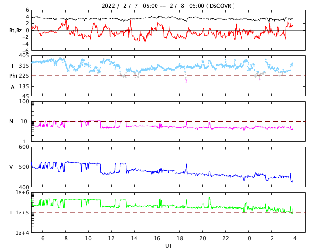 2022/ 2/ 8 13:02 更新 太陽風は平均的な速度に戻っています。太陽は穏やかです。 担当 篠原 太陽風の速度は、昨日のニュースの後もゆっくりと下がり、 現在は450km/秒と平均的な状態に戻っています。 磁場強度は4nTから3nTへ少し下がり、 やや弱くなっています。 磁場の南北成分は、変化は小さいですが、 南寄りの傾向が続いています。 速度が下がってきたため規模は小さくなっていますが、 AE指数は200〜500nTの変化が続いています。 SDO衛星AIA193では、 南東側(左下)に濃いコロナホールが見えています。 次の注目はこの領域です。 2〜3日後に中心線に達して、 その3日後くらいから高速の太陽風が始まると考えると、 13〜14日頃でしょうか。 27日周期の図を見ると、 前周期の太陽風は1月15日から速度が高まっています。 今回、コロナホールの場所が少し左に動いている様なので、 高速風到来のタイミングは少し遅れそうです。 実際にはどうなるでしょうか。 太陽は、西の端に沈んだ2938黒点群の活動が高まった様で、 C3.8やC2.4などの小規模フレアが 西の端(右端)で発生しています。 こちら側に見える領域では、 2939群、2941群で C1台の小さい小規模フレアが発生した程度です。 太陽は穏やかに推移しそうです。 ![]() SDO衛星のAIA193カメラによる太陽コロナの様子 (c) SDO (NASA) ![]() SDO衛星による太陽の可視光写真。マウスの矢印を写真に重ねると、黒点番号付きの写真に切り替わります。 (c) SDO (NASA) ![]() DSCOVRが観測した太陽風の磁場(黒線は全体の強度、赤線は南北成分) 磁場の向き、プラズマの密度、速度、温度 (c) データ:NOAA/SWPC、作図:宇宙天気ニュース ![]() AE指数(速報値) 下段のAEグラフの値が高くなると、オーロラ活動が活発化しています。 (c) 京都大学WDC ![]() ![]() 27日の太陽周期に合わせた図 太陽が同じ面を地球に向けていた27日前の変化から、今後を予想することができます。 (c) 作図:宇宙天気ニュース