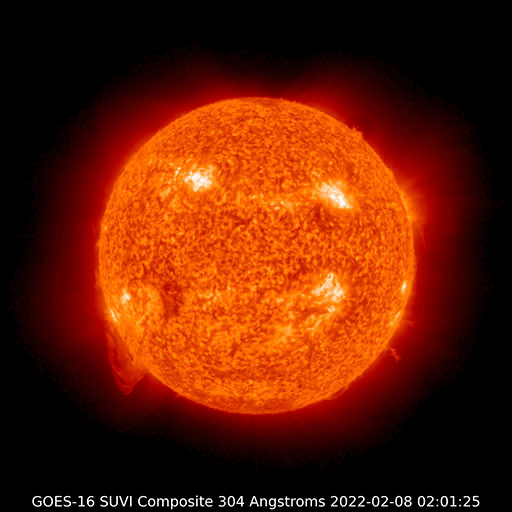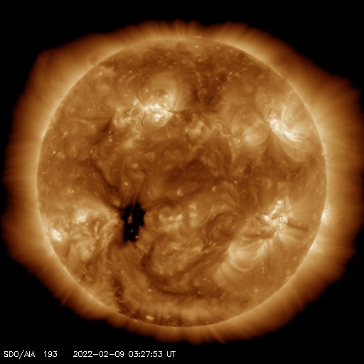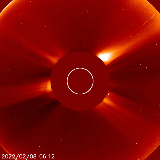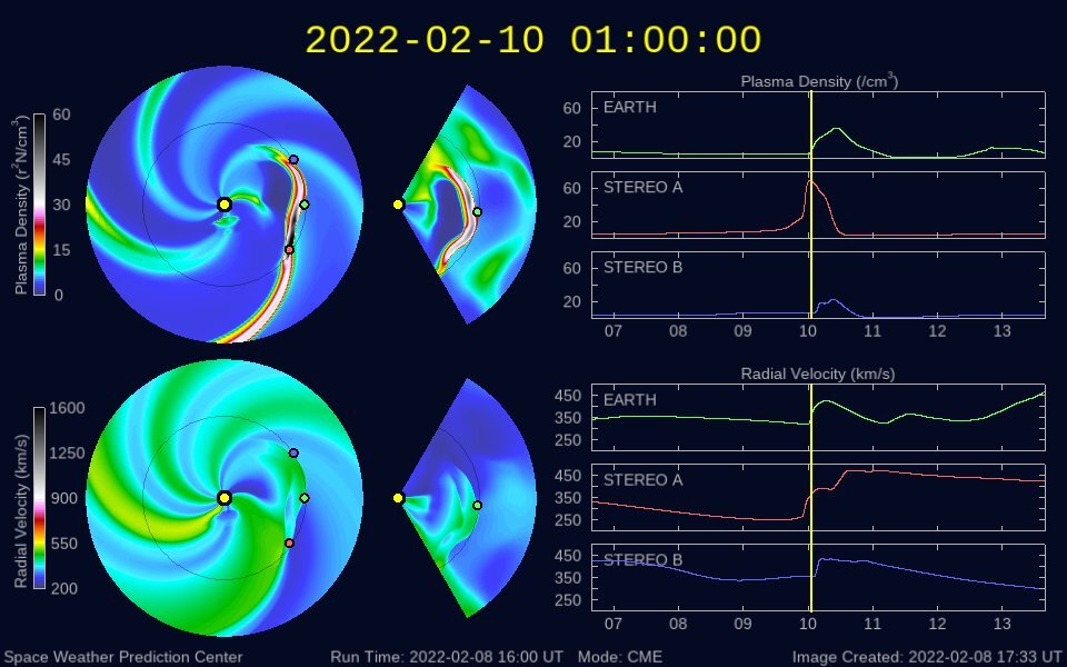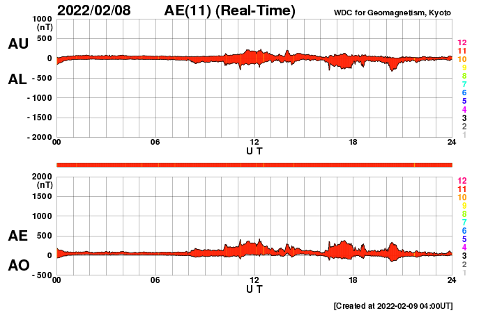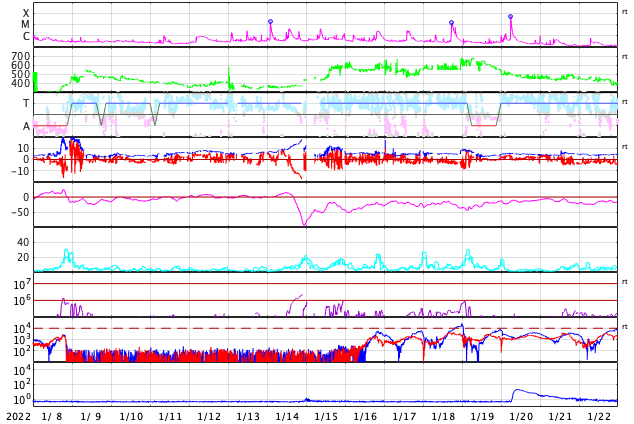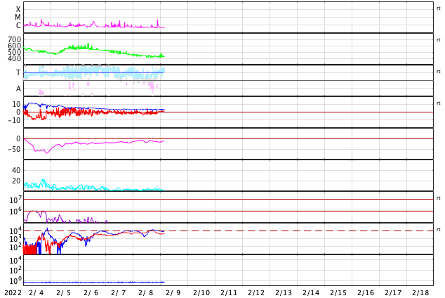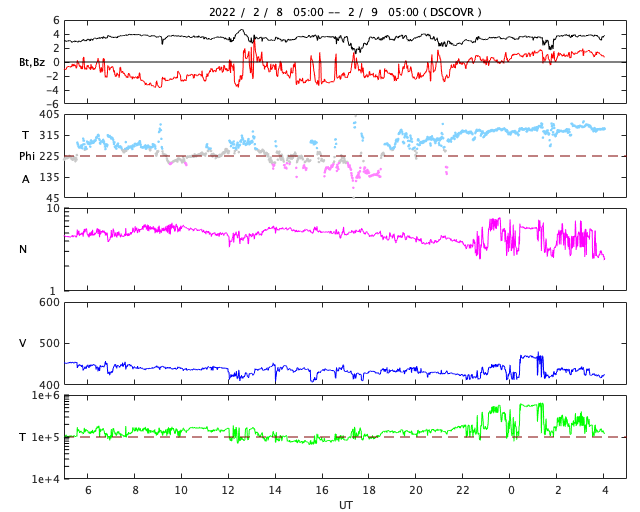 2022/ 2/ 9 13:19 更新 プロミネンス噴出が発生しました。太陽風の乱れが近付いています。 担当 篠原 昨日の午後、8日15時(世界時8日6時)頃に、 太陽の南東の端(左下)でプロミネンス噴出が発生しました。 GOES衛星SUVI 304による動画を掲載します。 このプロミネンスは、 数日前から大きさで注目されていたのですが、 とうとう飛び出して行きました。 CME(コロナ質量放出)が、 SOHO衛星LASCO C2、C3で観測されていて、 太陽から左下に向かってガスのかたまりがきれいに飛び出しています。 地球に対しては横向きなので、影響はありません。 太陽では、今朝、9日6時半(世界時8日21時半)に、 南西(右下)の2939黒点群で C5.1とやや大きい小規模フレアが発生しています。 目立ったフレアは、この程度です。 太陽風は、450km/秒から420km/秒へ速度が少し下がっていますが、 平均的な状態が続いています。 磁場強度は、3〜4nTとやや弱くなっています。 磁場の南北成分は、振れ幅は小さいですが、 南寄りから北寄りに傾向が変わっている様です。 AE指数は、グラフの中盤では小規模の変化が起きていますが、 後半は静かになっています。 太陽風の状況がこのままであれば、 磁気圏は静穏な状態が続くでしょう。 6日夜に発生したCMEによる太陽風の乱れが近付いています。 NOAA/SWPCの予報では(3枚目の図)、 明日の午前、10日10時(世界時10日1時)頃に 到来する可能性がある様です。 今夜以降、変化の到来に注目して下さい。 速度の変化は小幅に留まりそうですが、 磁場の強まりが到来して、南向きに大きな変化を作ると、 オーロラなどの磁気圏の活動が激しくなる可能性があります。 SDO衛星AIA193の太陽コロナ写真を見ると、 南半球のコロナホールが太陽の中心線に近付いています。 4〜5日後には、この領域の影響も始まるでしょう。 ![]() 太陽の南東の端で発生したプロミネンス噴出。GOES衛星SUVI 304。 (c) GOES (NOAA)、(動画加工 : 宇宙天気ニュース) ![]() 太陽の左下に噴出するCME。SOHO衛星LASCO C2、C3。 (c) SOHO (ESA & NASA)、 (動画加工 : 宇宙天気ニュース) ![]() 6日のCMEによる太陽風の乱れは、10日10時(世界時10日1時)頃に到来する可能性があります。 (c) NOAA/SWPC ![]() SDO衛星のAIA193カメラによる太陽コロナの様子 (c) SDO (NASA) ![]() SDO衛星による太陽の可視光写真。マウスの矢印を写真に重ねると、黒点番号付きの写真に切り替わります。 (c) SDO (NASA) ![]() GOES衛星の太陽X線強度。赤・橙 = 0.1〜0.8 nm、青・紫 = 0.05〜0.4 nm (c) データ:NOAA/SWPC、作図:宇宙天気ニュース ![]() DSCOVRが観測した太陽風の磁場(黒線は全体の強度、赤線は南北成分) 磁場の向き、プラズマの密度、速度、温度 (c) データ:NOAA/SWPC、作図:宇宙天気ニュース ![]() AE指数(速報値) 下段のAEグラフの値が高くなると、オーロラ活動が活発化しています。 (c) 京都大学WDC ![]() ![]() 27日の太陽周期に合わせた図 太陽が同じ面を地球に向けていた27日前の変化から、今後を予想することができます。 (c) 作図:宇宙天気ニュース