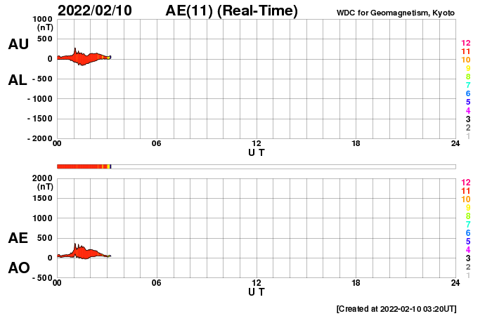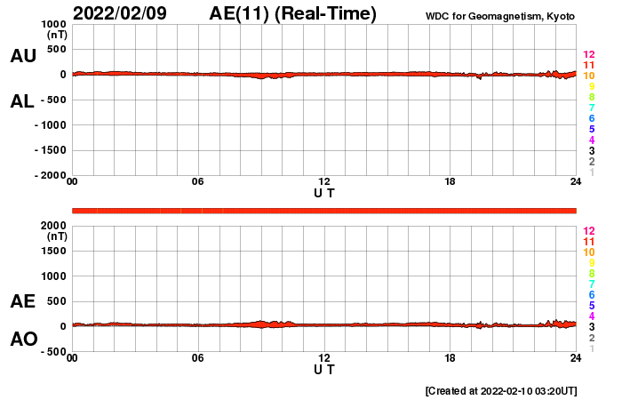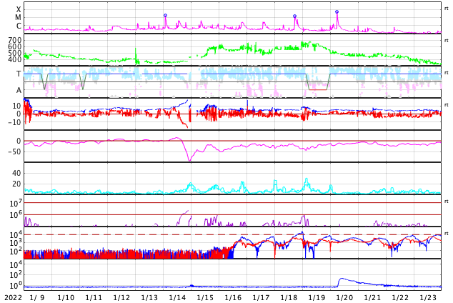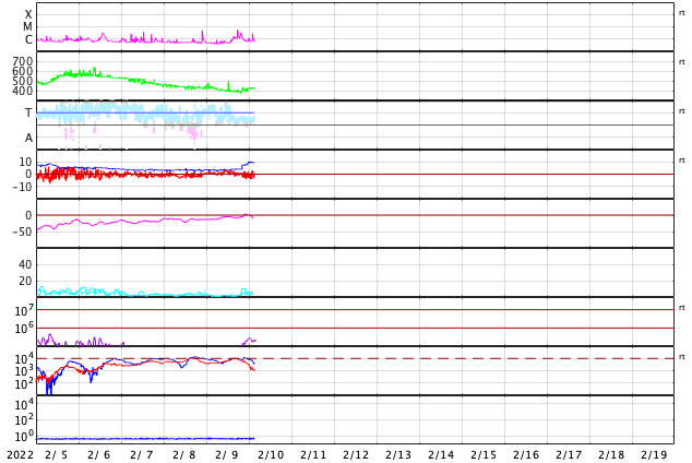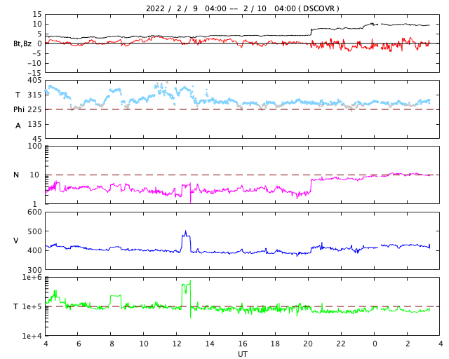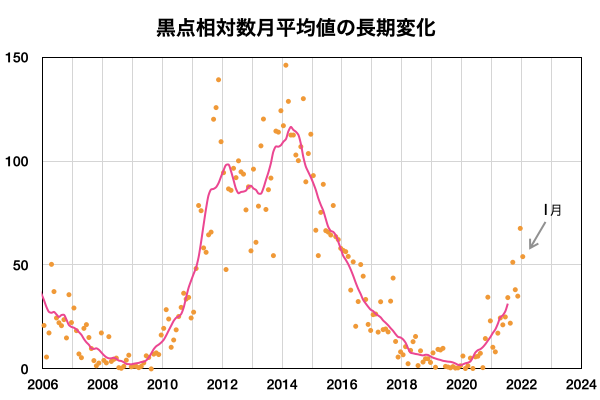 2022/ 2/10 12:37 更新 太陽風の小さい強まりが到来しました。1月の黒点相対数は 54.0 でした。 担当 篠原 WDC-SILSOより、 1月の黒点相対数は、54.0 と発表が行われています。 12月の67.6からは下がりましたが、 1枚目の図を見ると、 順調に上昇の傾向が続いていることが分かります。 前の周期の立ち上がりの頃を見ると、 3年目の初めの2011年1月の赤線の高さは、 今回とほぼ同じ50くらいになっています。 現在の第25期は、前の第24期とほぼ同じ変化が続いています。 1か月の可視光写真を繋げた動画を2枚目に掲載します。 今回は群番号を加えた写真を使ってみました。 こちらの方が黒点の動きが分かりやすい様に思います。 今朝、10日5時(世界時9日20時)に、 DSCOVR衛星で太陽風の小さい強まりが観測されました。 速度は390km/秒から420km/秒へ、 磁場強度は4nTから8nTと、どちらも小幅の変化です。 6日夜に発生したフィラメント噴出による CMEの乱れが到来した様です。 速度の変化は小さいだろうと考えていましたが、 磁場強度も目立つ程の強まりにはなりませんでした。 南北成分は0nTか弱い南向き程度で、 磁気圏は概ね静穏です。 AE指数は200nTの小さい変化が起きている程度です。 SDO衛星AIA193では、 南半球のコロナホールは太陽の中心線にほぼ達しています。 3日後くらいからこの領域の影響で太陽風が強まりそうです。 太陽は、2939黒点群でC5.7、 2941群でC3.1、2940群でC3.0と、 3つの黒点群それぞれで小規模フレアが発生しています。 2941群は太陽の中心に近いので、 活動が強まる様であれば注目して下さい。