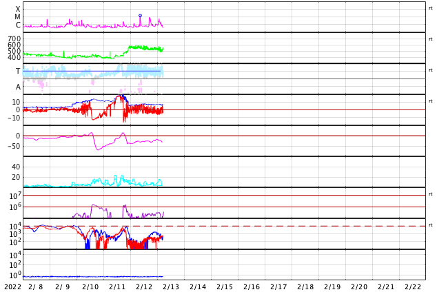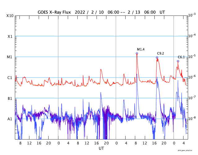 GOES衛星の太陽X線強度。赤・橙 = 0.1〜0.8 nm、青・紫 = 0.05〜0.4 nm (c) データ:NOAA/SWPC、作図:宇宙天気ニュース ![]() | ||||||||||||||||||||||||||||||||||||||||||||||||||||||||||||||||||||||||||||||||||||||||||||||||||||||||||||||||||||||||||||||||||||||||||||||||||||||||||||||||||||||||||||||||||||||||||||||||||||||||||||||||||||||||||||||||||||||||