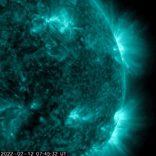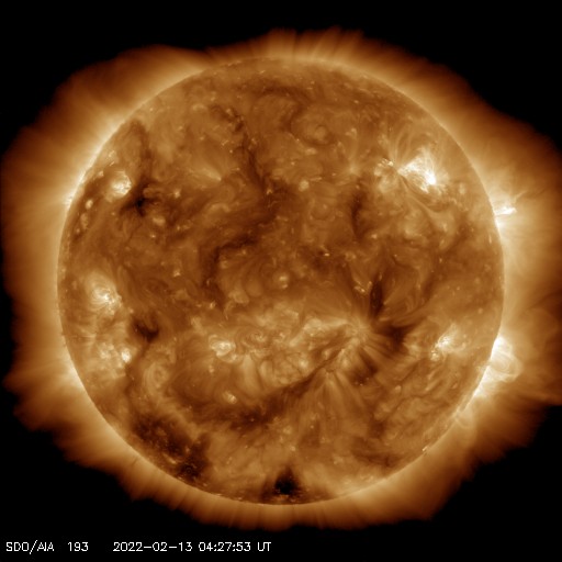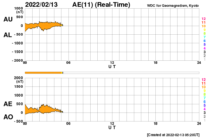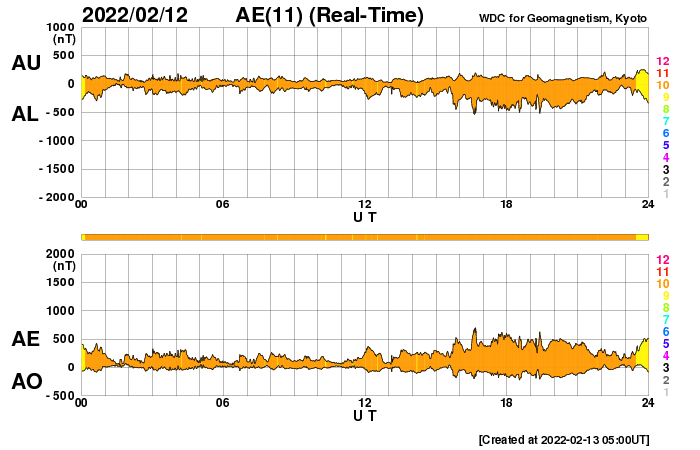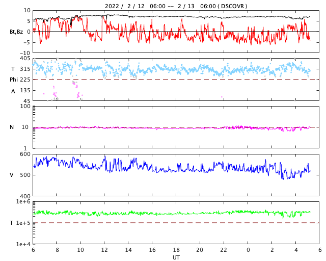 2022/ 2/13 14:24 更新 高速の太陽風が続いています。磁気圏もやや活動的です。 担当 篠原 太陽風は、570km/秒から500km/秒へ ゆっくりと速度が下がっていますが、 高速の状態が続いています。 磁場強度は、7nTと少し強まっています。 磁場の南北成分は、弱い南寄りの変化が続いています。 磁気圏の活動もやや高まっていて、 AE指数は、200〜500nTくらいの変化が連続しています。 高速太陽風はもうしばらく続くのか、 これから速度が下がって行くのか、 この後の変化に注目してください。 太陽では、西側の4か所でフレアが次々と発生しています。 SDO衛星AIA131の動画で昨日の夕方からの変化を紹介します。 最初に明るく光る、M1.4の中規模フレアは、 南西(右下)に沈んだ2939黒点群で発生しました。 続いて、C9.2が北東(右上)の2940群で発生し(もう沈んでいます)、 直後により南側の2944群でC8.0が発生しています。 そして、北側の少し内側でC6.1のフレアが、今朝発生しています。 沈んでしまった領域の活動が多いので、 この後の太陽は少し静かになってしまいそうです。 ![]() 太陽の西側のあちこちでC、Mクラスのフレアが発生しています。SDO衛星AIA131。 (c) SDO (NASA)、(動画加工 : 宇宙天気ニュース) ![]() SDO衛星のAIA193カメラによる太陽コロナの様子 (c) SDO (NASA) ![]() SDO衛星による太陽の可視光写真。マウスの矢印を写真に重ねると、黒点番号付きの写真に切り替わります。 (c) SDO (NASA) ![]() DSCOVRが観測した太陽風の磁場(黒線は全体の強度、赤線は南北成分) 磁場の向き、プラズマの密度、速度、温度 (c) データ:NOAA/SWPC、作図:宇宙天気ニュース ![]() AE指数(速報値) 下段のAEグラフの値が高くなると、オーロラ活動が活発化しています。 (c) 京都大学WDC ![]() ![]() 27日の太陽周期に合わせた図 太陽が同じ面を地球に向けていた27日前の変化から、今後を予想することができます。 (c) 作図:宇宙天気ニュース