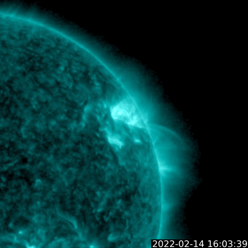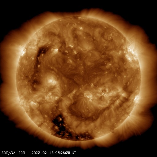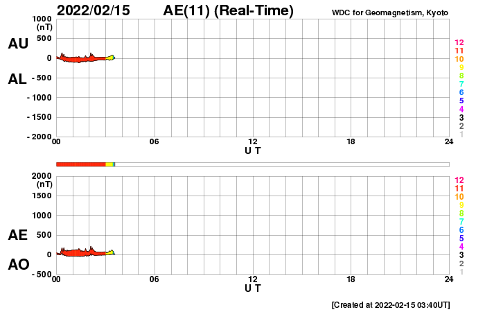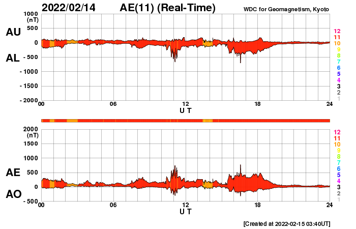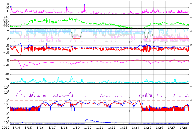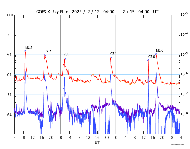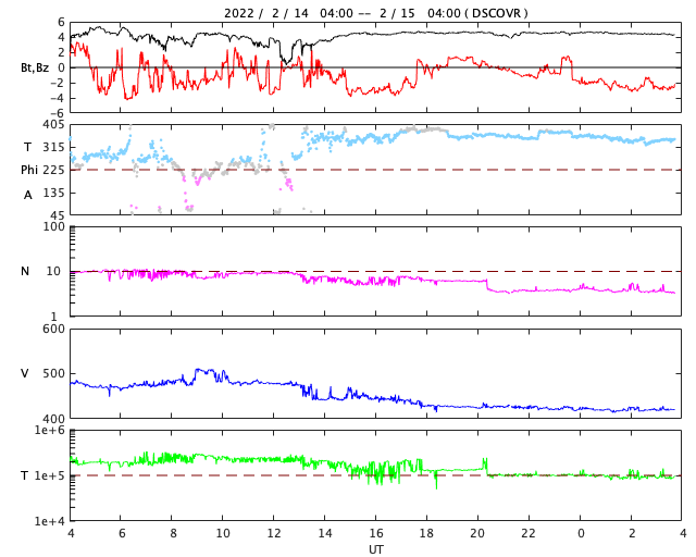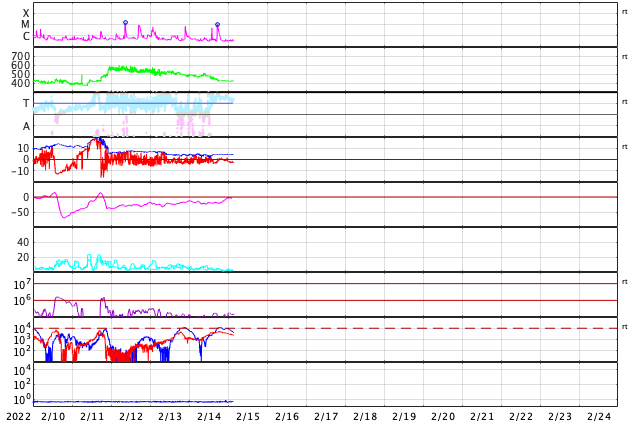 2022/ 2/15 13:00 更新 M1.0の中規模フレアが発生しました。太陽風は平均的な状態です。 担当 篠原 太陽の北西(左上)の2941黒点群で、 今日未明、15日2時(世界時14日17時)に、 M1.0の中規模フレアが発生しました。 フレアの様子を、GOES衛星SUVI 131の動画で紹介します。 この領域は、掲載のX線グラフの中で C6.1、C7.3、C5.0という 大きめのCクラスフレアをぽつぽつと起こして来て、 今回、Mクラスに到達しました。 この後、西の端に近付いていきますが、 沈む前に次の活動を起こすでしょうか。 その他に活動が目立つ領域はありませんが、 2943群の黒点が復活したり、 新しい黒点が現れたりしています。 太陽風は、速度が420km/秒に下がり、 平均的な速さになっています。 磁場強度も5nTと平均的です。 磁場の南北成分は、弱い南寄りの傾向が続いていて、 AE指数は、途中まで小規模の活動が続いています。 グラフの最後で変化がなくなっていますが、 太陽風磁場の磁場の傾向が続けば、 この後も小さい変化が見られるのではないでしょうか。 SDO衛星AIA193では、南極から縦に伸びるコロナホールと、 北東側(左上)の縦のコロナホールが目立っています。 北東の領域は前周期よりも広がりが大きくなっている様で、 27日周期の図で前周期の1月25日に始まる太陽風速度の高まりは、 より大きい高まりになるかもしれません。