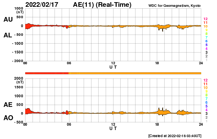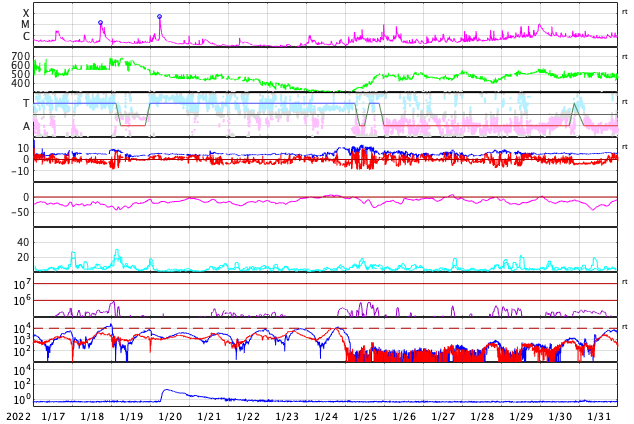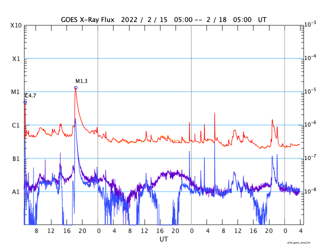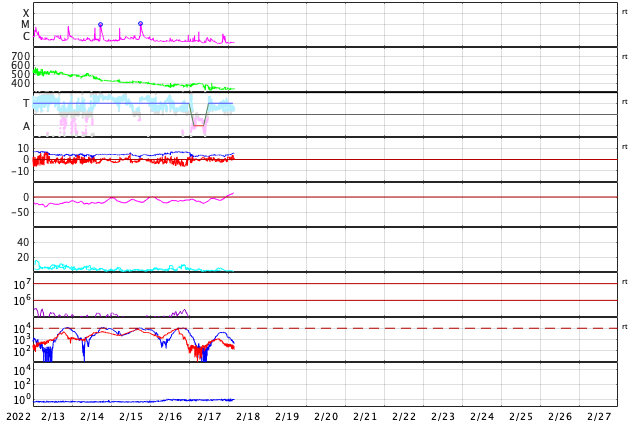 GOES衛星の太陽X線強度。赤・橙 = 0.1〜0.8 nm、青・紫 = 0.05〜0.4 nm (c) データ:NOAA/SWPC、作図:宇宙天気ニュース ![]() | ||||||||||||||||||||||||||||||||||||||||||||||||||||||||||||||||||||||||||||||||||||||||||||||||||||||||||||||||||||||||||||||||||||||||||||||||||||||||||||||||||||||||||||||||||||||||||||||||||||||||||||||||||||||||||||||||||||||