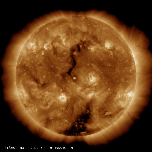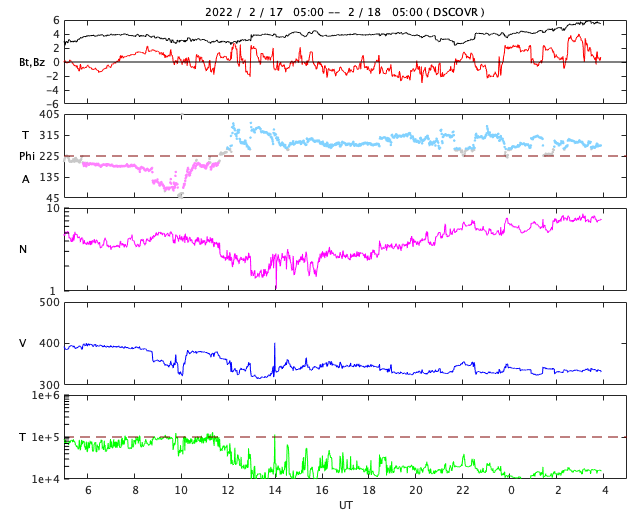2022/ 2/18 13:02 更新 太陽風は低速です。これから速度が高まるかもしれません。 担当 篠原 太陽風の速度は330km/秒へ下がり、 低速の状態になっています。 磁場強度は4nTで推移していましたが、 グラフの最後で6nTに少し上がっています。 コロナホールによる高速風が近付いているのかもしれません。 磁気圏は穏やかで、 AE指数は小さい変化が時々発生している程度です。 SDO衛星AIA193は、 南極から伸びるコロナホールが西側に進んでいて、 この後、影響が始まる可能性があります。 また、北半球低緯度のコロナホールの影響も 2〜3日後に始まりそうです。 太陽は、北東(左上)の2950黒点群で C1.4の小規模フレアが発生しています。 特に活動的という様子ではないので、 太陽は穏やかに推移しそうです。 STEREO Ahead衛星によると、 北東の端の向こう側に活動的な領域がある様で、 次の注目はここになりそうです。 ![]() SDO衛星のAIA193カメラによる太陽コロナの様子 (c) SDO (NASA) ![]() SDO衛星による太陽の可視光写真。マウスの矢印を写真に重ねると、黒点番号付きの写真に切り替わります。 (c) SDO (NASA) ![]() DSCOVRが観測した太陽風の磁場(黒線は全体の強度、赤線は南北成分) 磁場の向き、プラズマの密度、速度、温度 (c) データ:NOAA/SWPC、作図:宇宙天気ニュース ![]() AE指数(速報値) 下段のAEグラフの値が高くなると、オーロラ活動が活発化しています。 (c) 京都大学WDC ![]() ![]() 27日の太陽周期に合わせた図 太陽が同じ面を地球に向けていた27日前の変化から、今後を予想することができます。 (c) 作図:宇宙天気ニュース