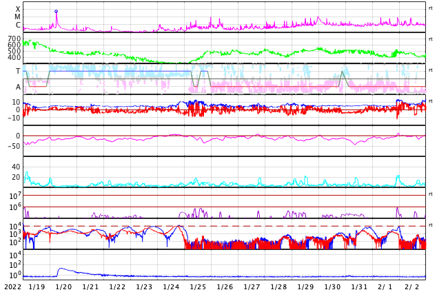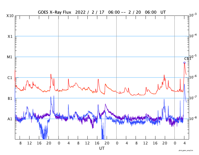 GOES衛星の太陽X線強度。赤・橙 = 0.1〜0.8 nm、青・紫 = 0.05〜0.4 nm (c) データ:NOAA/SWPC、作図:宇宙天気ニュース ![]() | ||||||||||||||||||||||||||||||||||||||||||||||||||||||||||||||||||||||||||||||||||||||||||||||||||||||||||||||||||||||||||||||||||||||||||||||||||||||||||||||||||||||||||||||||||||||||||||||||||||||||||||||||||||||||||||