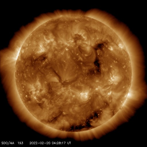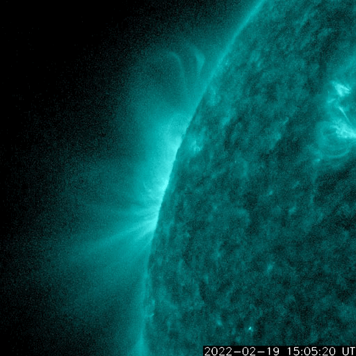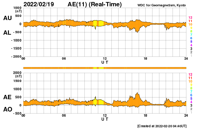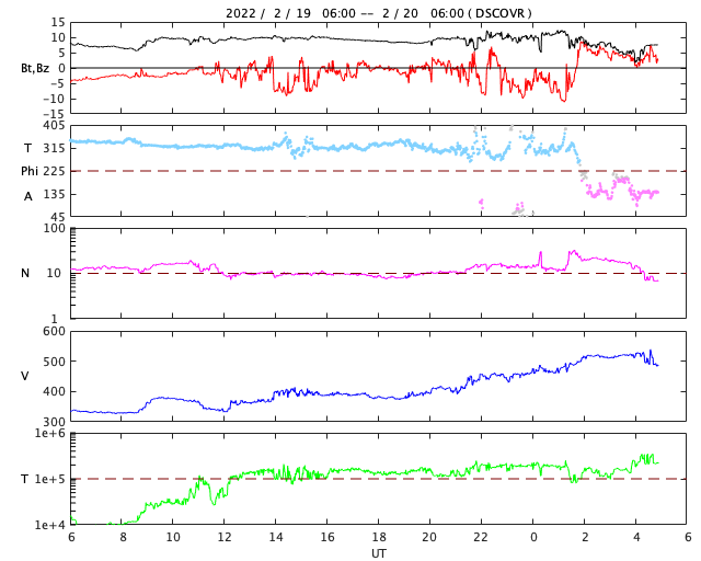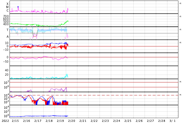 2022/ 2/20 14:01 更新 太陽風の速度が高まっています。C5.2の小規模フレアが発生しました。 担当 篠原 330km/秒と低速だった太陽風は、 昨夜から上昇が始まり、 20日11時(世界時20日2時)頃に500km/秒を超えて、 高速の風に変わりました。 コロナホールの影響が始まった様です。 現在の速度は、520〜530km/秒です。 一方、太陽風の磁場強度は 午前中までは10nT程度に強まった状態が続いていましたが、 現在は5nT程度に下がっています。 磁場の南北成分は、 南寄りが続いていましたが、 速度が高まった頃に北寄りに傾向が切り替わっています。 AE指数のグラフは、 ここまでは300〜500nTの小規模の変化が続いていますが、 この後は穏やかになりそうです。 27日周期の図を見ると、 前周期の太陽風は、 1月25日以降速度の高まりがずっと続いています。 一方、SDO衛星AIA193では、 太陽の中心部にはっきり見える様なコロナホールはありません。 今回は高速の太陽風がどこまで続くか、注目してください。 太陽は、北東の端の向こう側から活動的な領域が近づいています。 ここで、20日13時(世界時20日4時)に、 C5.2とやや大きい小規模フレアが発生しました。 少し前の時間からのSDO衛星AIA131の動画を掲載します。 発生領域が完全には見えていないので、 本当の規模はこれよりも大きかったかもしれません。 太陽の可視光写真では、黒点が見え始めています。 この後、どの様な領域が現れるでしょうか。