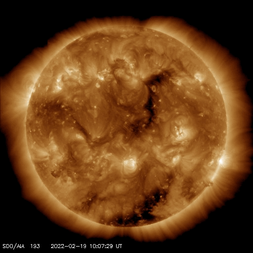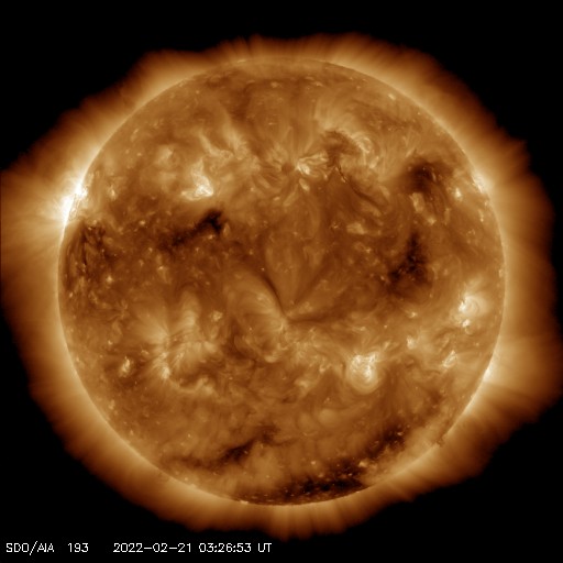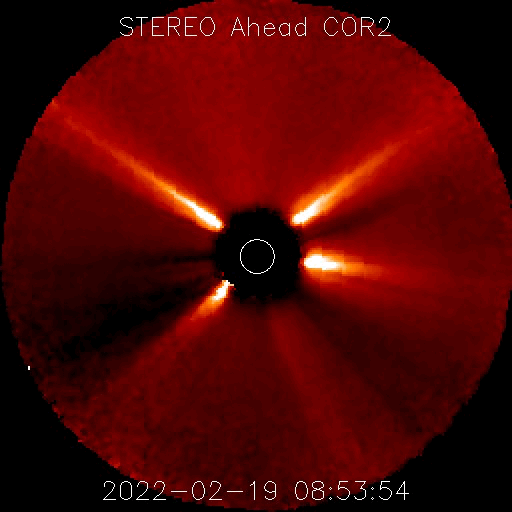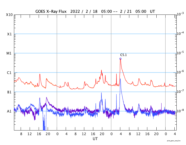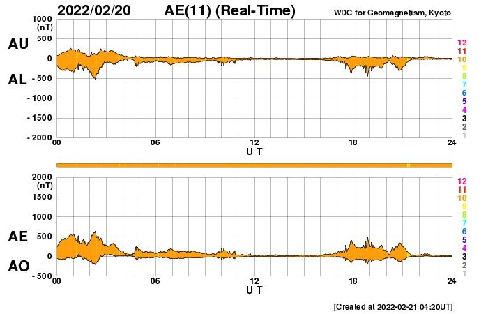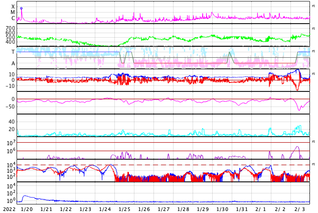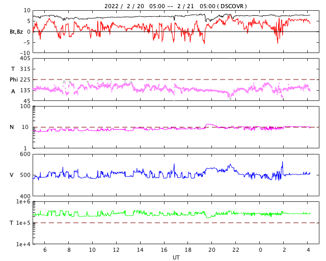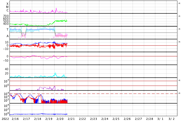 2022/ 2/21 13:27 更新 太陽風の弱い乱れが到来するかもしれません。高速の太陽風が続いています。 担当 篠原 一昨日の現象ですが、 SDO衛星AIA193の動画を見ると、 19日21時(世界時19日12時)に太陽の中心部の北側で、 20日2時(世界時19日17時)に南東側(左下))で、 それぞれ爆発現象が発生していました。 STEREO Ahead衛星COR2の動画によると、 初めの爆発で太陽の北寄りに、次の爆発で太陽の南寄りに 淡いCME(コロナ質量放出)が飛び出している事が分かります。 初めのCMEは、地球の正面で発生しているので、 明日か明後日くらいに太陽風の磁場の強まりなどが 到来するかもしれません。 2つめのCMEは、地球に対しては斜め方向ですが、 遅れて影響が到来する可能性があります。 磁場が南向きに強まると、磁気圏の活動は活発になります。 変化が到来するか注目してください。 現在の太陽では、北東の端(左上)から新しい黒点が現れて、 2954黒点群と番号が付けられています。 拡大写真を見ると、その左下側にもう一つ黒点が現れていて、 小さい活動を活発に起こしているのは、 こちらの領域の様です。 X線グラフは、昨日のC5.1以降目立った変化は発生していませんが、 今後の推移に注目してください。 太陽風は、500km/秒と高速の状態が続いています。 磁場強度は、8nTとやや強まっています。 磁場の南北成分は、グラフの中盤までは南北に変化していますが、 後半は北寄りになっています。 AE指数も途中までは300nTの小規模の変化が発生していますが、 現在は変化が見られなくなっています。
