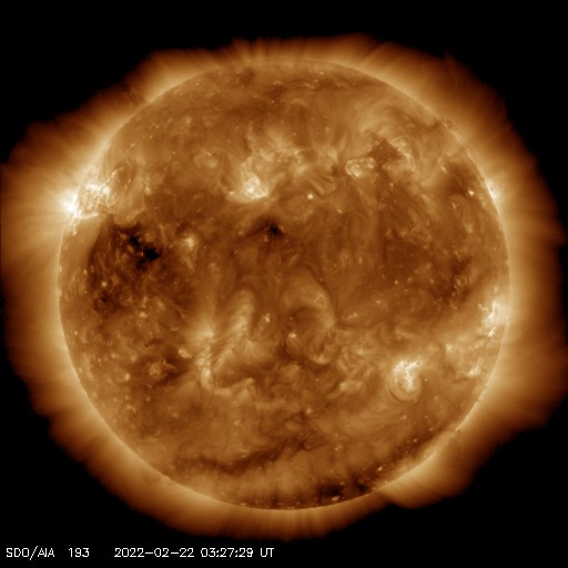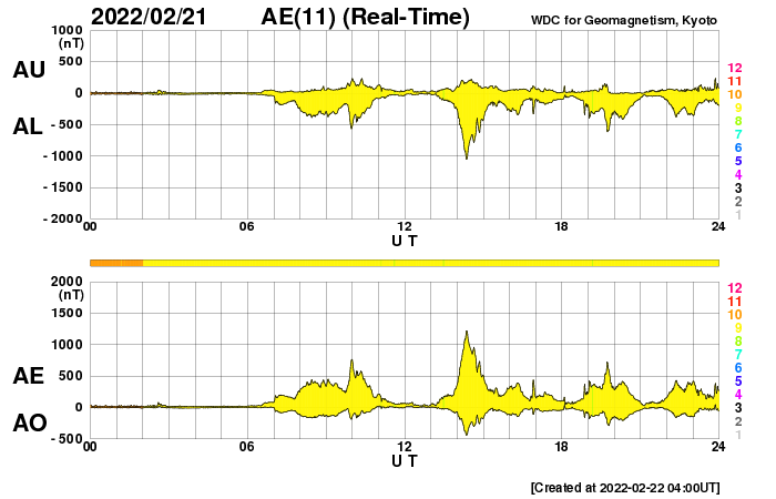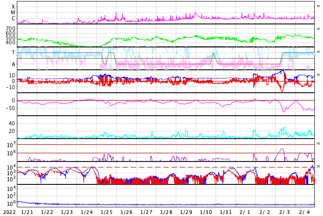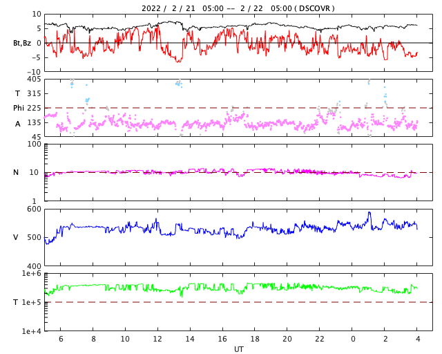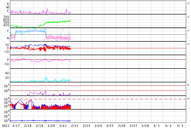 2022/ 2/22 13:16 更新 高速の太陽風が続き、磁気圏も活動的です。 担当 篠原 太陽風は、540km/秒と少し速度が高まって、 高速の状態が続いています。 磁場強度は少し下がって、5nTと平均的な状態です。 磁気の南北成分は、 再び南北の変化が続く様になっています。 このため、磁気圏の活動も高まって、 AE指数は500〜1200nTの中規模の変化が 数時間おきに発生しています。 SDO衛星AIA193では、 太陽の中心部にコロナホールはありませんが、 東側に広い領域がある様です。 太陽風の速度は、今後一旦下がって、 5〜6日後くらいに再び高まるような変化をするかもしれません。 太陽は、北東の端(左上)に現れた黒点に 2955群と番号が付けられています。 この領域で、今朝早く、22日3時半(世界時21日18時半)にC3.1、 その直後にC2.3の小規模フレアが発生しています。 この後も活動は続くでしょうか。