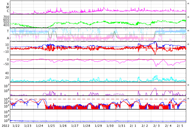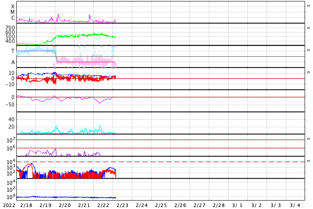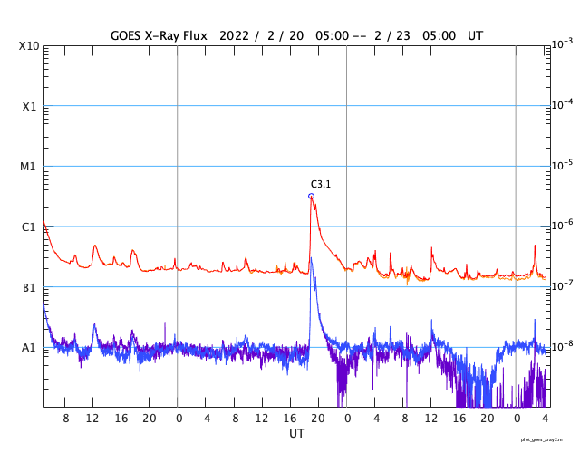 GOES衛星の太陽X線強度。赤・橙 = 0.1〜0.8 nm、青・紫 = 0.05〜0.4 nm (c) データ:NOAA/SWPC、作図:宇宙天気ニュース ![]() | ||||||||||||||||||||||||||||||||||||||||||||||||||||||||||||||||||||||||||||||||||||||||||||||||||||||||||||||||||||||||||||||||||||||||||||||||||||||||||||||||||||||||||||||||||||||||||||||||||||||||||||||||||||||