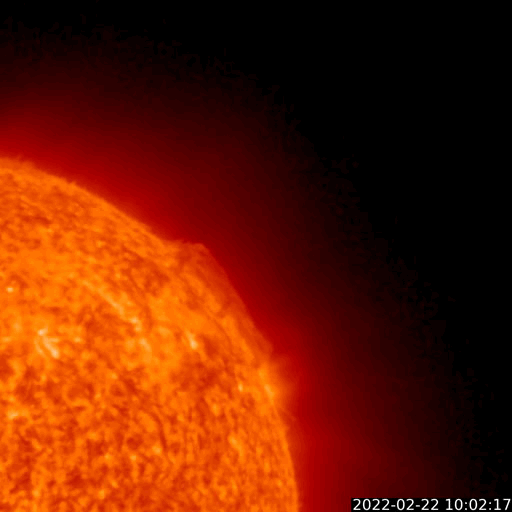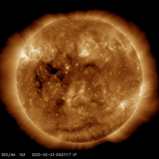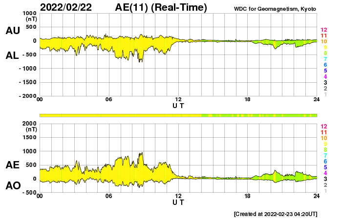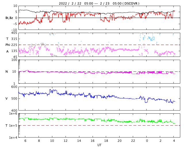 2022/ 2/23 13:26 更新 太陽風の速度はゆっくりと下がっています。磁気圏は穏やかです。 担当 篠原 540km/秒に高まっていた太陽風の速度は、 今日に入った頃から少しずつ下がり続け、 現在は470km/秒とやや高速程度になっています。 コロナホールの影響は終わりになりそうです。 磁場強度は4〜5nTと平均的な状態です。 南北成分は、グラフの途中から北寄りの傾向になっています。 このため、磁気圏の活動は小さくなっていて、 AE指数は、初めの頃に活発な変化が発生していますが、 中盤以降は、一時的に小規模の変化が発生する程度です。 SDO衛星AIA193では、 太陽の中心部の東側(左側)にコロナホールが見えています。 4日後くらいにこの影響が始まりそうです。 太陽では、昨夜、22日21時(世界時22日12時)に、 北西の端(右上)でプロミネンスの噴出が発生しています。 GOES衛星SUVI 304の動画を掲載します。 これにより、太陽の右上に向かって 弱いCME(コロナ質量放出)が発生していますが、 地球への影響はありません。 北東(左上)の2955黒点群では、 Bクラスの小さいフレアが頻繁に発生しています。 規模が大きくなる様であれば、注意が必要になるでしょう。 ![]() 太陽の北西端で発生したプロミネンス噴出。GOES衛星SUVI 304。 (c) GOES (NOAA)、(動画加工 : 宇宙天気ニュース) ![]() SDO衛星のAIA193カメラによる太陽コロナの様子 (c) SDO (NASA) ![]() SDO衛星による太陽の可視光写真。マウスの矢印を写真に重ねると、黒点番号付きの写真に切り替わります。 (c) SDO (NASA) ![]() DSCOVRが観測した太陽風の磁場(黒線は全体の強度、赤線は南北成分) 磁場の向き、プラズマの密度、速度、温度 (c) データ:NOAA/SWPC、作図:宇宙天気ニュース ![]() AE指数(速報値) 下段のAEグラフの値が高くなると、オーロラ活動が活発化しています。 (c) 京都大学WDC ![]() ![]() 27日の太陽周期に合わせた図 太陽が同じ面を地球に向けていた27日前の変化から、今後を予想することができます。 (c) 作図:宇宙天気ニュース