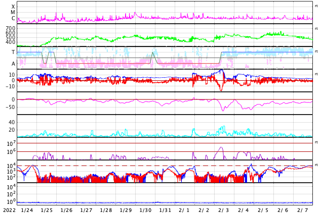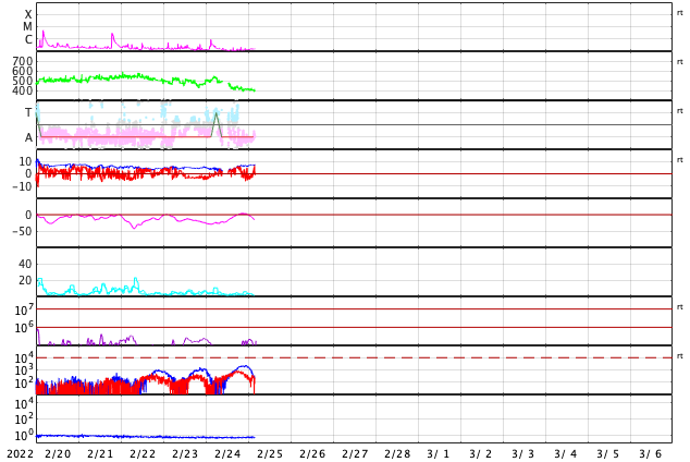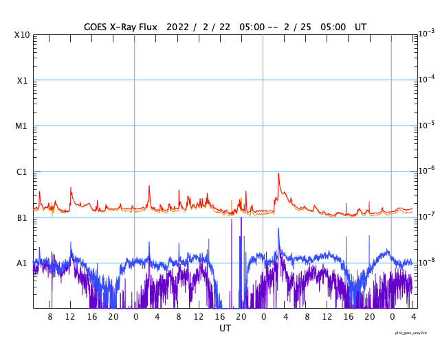 GOES衛星の太陽X線強度。赤・橙 = 0.1〜0.8 nm、青・紫 = 0.05〜0.4 nm (c) データ:NOAA/SWPC、作図:宇宙天気ニュース ![]() | ||||||||||||||||||||||||||||||||||||||||||||||||||||||||||||||||||||||||||||||||||||||||||||||||||||||||||||||||||||||||||||||||||||||||||||||||||||||||||||||||||||||||||||||||||||||||||||||||||||||||||||||||||||