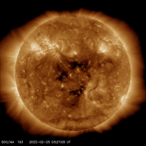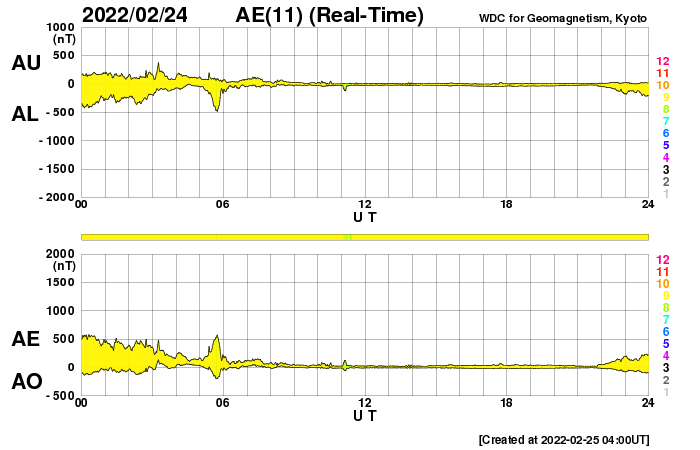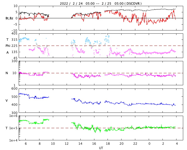 2022/ 2/25 13:08 更新 太陽風は平均的な速度になっています。太陽は穏やかです。 担当 篠原 太陽風の速度は、昨夜遅くから低下して、 今朝以降は400k/秒と平均的な速さで安定しています。 磁場強度は、今日に入った頃からゆっくりと強まって、 現在は7nTと少し強まった状態です。 磁場の南北成分は、 北向きから南向きにゆっくり変化して、 グラフの最後で再び北向きになっています。 AE指数は、グラフの中盤は変化がありませんでしたが、 後半で小規模の変化が発生しています。 現在は磁場が北向きなので、 この後は、再び静かになりそうです。 SDO衛星AIA193では、 太陽の中心部にコロナホールが見えています。 明後日くらいから、 この領域の影響で太陽風の速度が高まりそうです。 太陽は、昨日のB9.3以降はX線グラフに変化はなく、 穏やかに推移しています。 黒点群も2つ見えているだけになっています。 NOAA/SWPCの黒点群リストが2群だけになるのは、 1月25日以来、1か月ぶりです。 (群番号リストにない黒点が見えていることも多いので、 参考程度に考えて下さい) SDO衛星AIA193の写真でも見え始めていますが、 今後、南東の端(左下)から活動的な領域が現れそうです。 タイミングから考えると、 今月上旬に見えていた2939黒点群が 太陽の向こう側を回って戻ってくるのかもしれません。 また、STEREO Ahead衛星によると、 これに続く様に、北東(左上)にも別の領域がある様です。