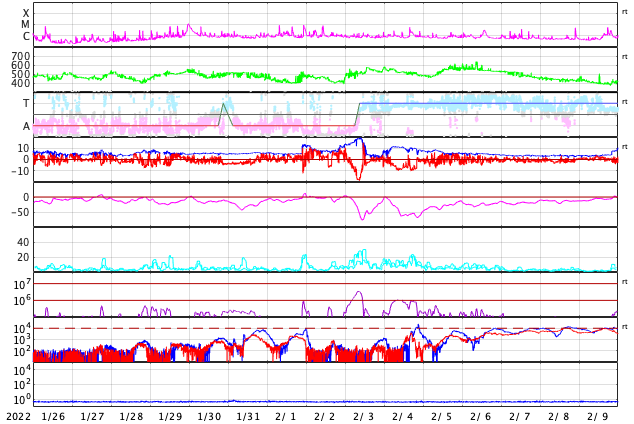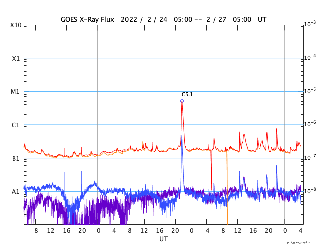 GOES衛星の太陽X線強度。赤・橙 = 0.1〜0.8 nm、青・紫 = 0.05〜0.4 nm (c) データ:NOAA/SWPC、作図:宇宙天気ニュース ![]() | ||||||||||||||||||||||||||||||||||||||||||||||||||||||||||||||||||||||||||||||||||||||||||||||||||||||||||||||||||||||||||||||||||||||||||||||||||||||||||||||||||||||||||||||||||||||||||||||||||||||||||||||||||||