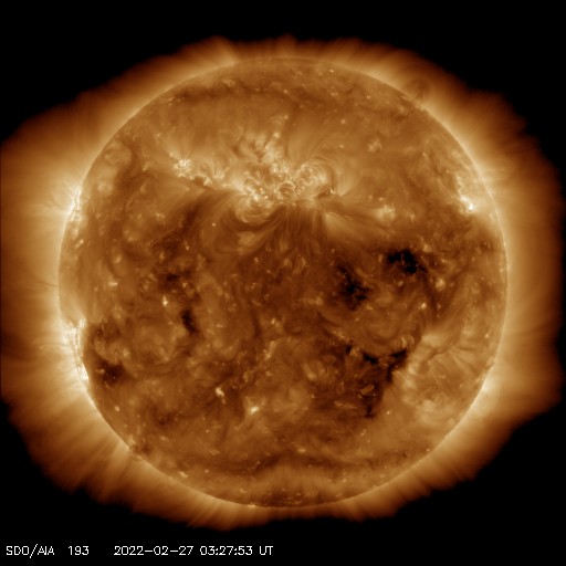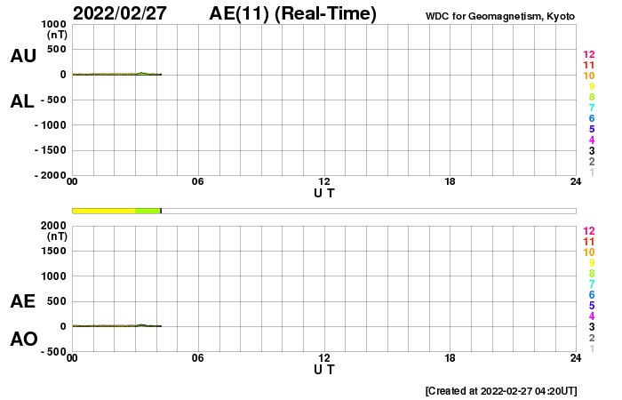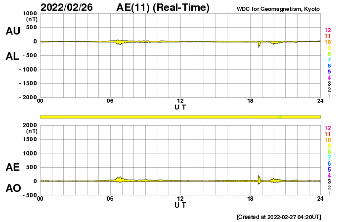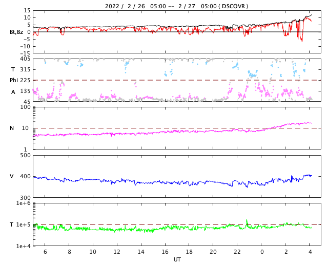 2022/ 2/27 13:22 更新 これから太陽風の速度が高まるかもしれません。Bクラスの小さいフレアが続いています。 担当 篠原 太陽風の速度は、昨夜にかけて370km/秒へ少し下がり、 今朝からは少し上がって 現在は400km/秒と平均的な速さです。 一方、磁場強度は、 4nTからグラフの最後で11nTに強まっています。 コロナホールの影響が始まっているのかもしれません。 この後、速度も上昇を始める可能性があります。 太陽風磁場の南北成分は、 北寄りの傾向で推移しています。 このため磁気圏は穏やかで、 AE指数はほとんど変化がありません。 現在は磁場が強まっているので、 南北成分の傾向が南寄りに切り替わると、 磁気圏の活動は活発になる可能性があります。 注目してください。 太陽は、南東の端(左下)の領域で、 Bクラスの小さいフレアが頻発するようになっています。 現在は規模が小さいですが、 この後規模が大きくなる様であれば、注意が必要になるでしょう。 南東に見えていた小さい黒点は、 今日は少し大きくなっています。