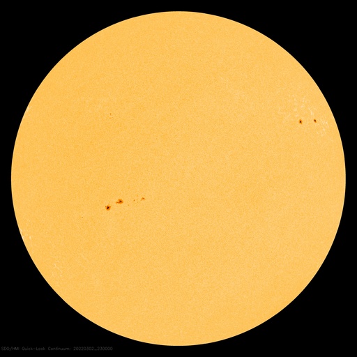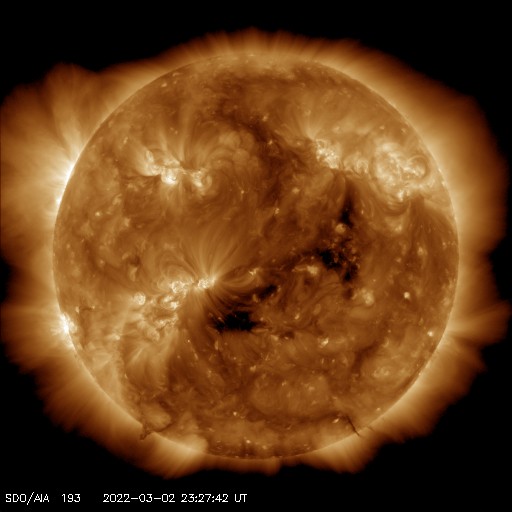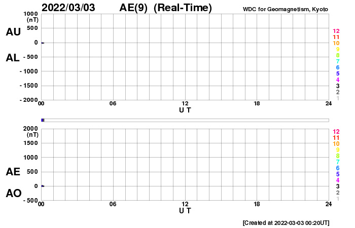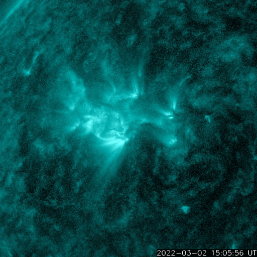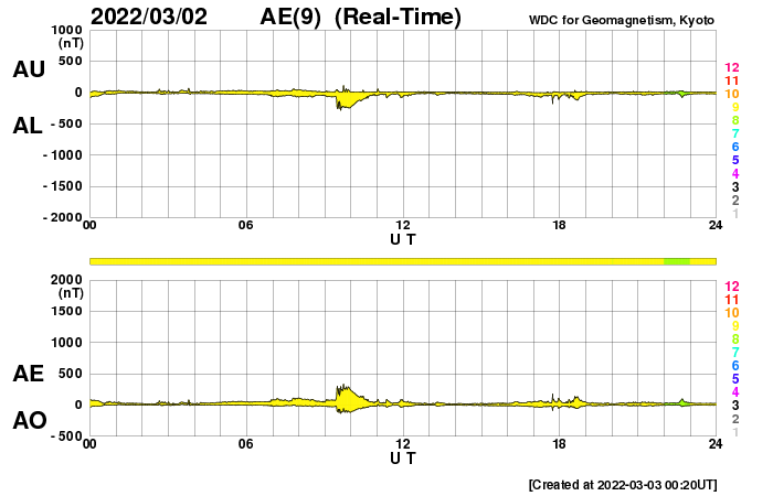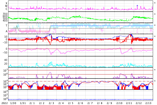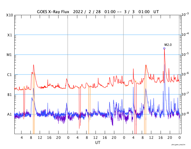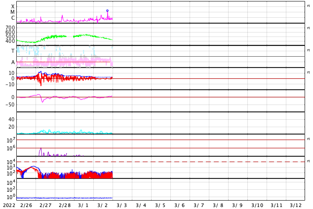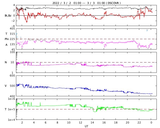 2022/ 3/ 3 09:21 更新 M2.0の中規模フレアが発生しました。太陽風は平均的な速度に戻っています。 担当 篠原 今日未明、3日2時半(世界時2日17時半)に、 太陽の北東側(左上)の2958黒点群で M2.0の中規模フレアが発生しました。 SDO衛星AIA131の動画を掲載します。 中規模フレアの発生は、世界時2月15日のM1.3以来です。 太陽では、この他にも南東(左下)の2957群でC3.0が、 北西(右上)の領域でも小さいフレアが発生し、 これら3つの現象に伴って、 弱いCME(コロナ質量放出)が発生している様です。 3日後くらいに、 太陽風磁場の強まりなどの影響があるかもしれません。 また、太陽の南東の端から新しい黒点が現れ、 北東の端にも新しい領域が近づいています。 今後の太陽の活動に注目してください。 太陽風は、昨日の午後以降は速度が次第に低下し、 現在は420km/秒と平均的な速さに戻っています。 磁場強度は、3nTとやや弱い状態です。 磁気圏は穏やかで、 AE指数は小規模の活動が1回起きている程度です。 SDO衛星AIA193の太陽コロナ写真では、 コロナホールが西に進み、 地球に影響が及び始める目安の位置に近づいています。 再び速度の高まりが始まりそうです。