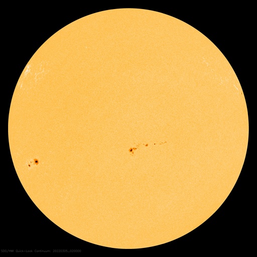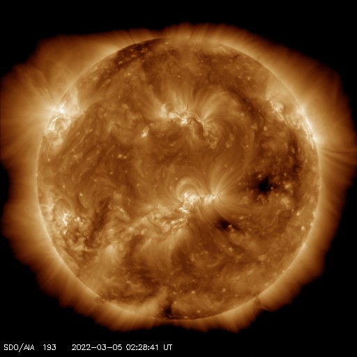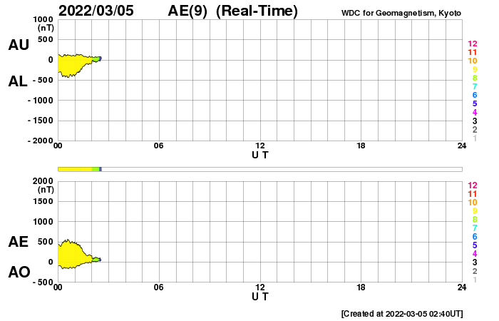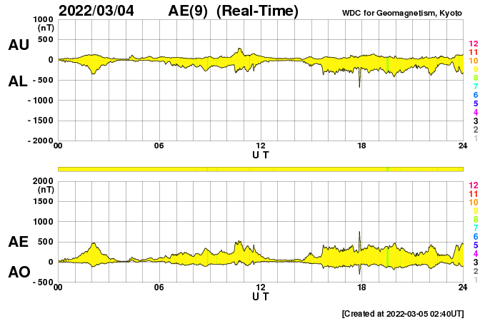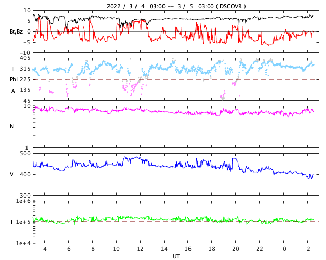 2022/ 3/ 5 11:45 更新 太陽風の速度は特に高まらず、平均的な状態です。 担当 篠原 太陽風の速度は、昨日の午後に450km/秒へ少し高まりましたが、 今日に入ると下がり始め、現在は400km/秒と平均的な状態です。 磁場強度は、7nTとやや強まった状態で推移しています。 SDO衛星AIA193を見ると、 コロナホールは西の端に近付いています。 影響はこの程度で終わるのか、遅れてこれから始まるのか、 もうしばらく注目してください。 磁場の南北成分は南寄りになっています。 磁気圏の活動はやや高まっていて、 AE指数は400〜500nTの小規模の変化が続いています。 太陽は、南東(左下)の2960黒点群で C1台の小さい小規模フレアが3回発生しましたが、 X線グラフの変化は次第に小さくなり、 現在はBクラスの変化に留まっています。 北東の端(左上)に現れた領域は、 とても小さい黒点が1つ微かに見える程度でした。 ![]() SDO衛星のAIA193カメラによる太陽コロナの様子 (c) SDO (NASA) ![]() SDO衛星による太陽の可視光写真。マウスの矢印を写真に重ねると、黒点番号付きの写真に切り替わります。 (c) SDO (NASA) ![]() DSCOVRが観測した太陽風の磁場(黒線は全体の強度、赤線は南北成分) 磁場の向き、プラズマの密度、速度、温度 (c) データ:NOAA/SWPC、作図:宇宙天気ニュース ![]() AE指数(速報値) 下段のAEグラフの値が高くなると、オーロラ活動が活発化しています。 (c) 京都大学WDC ![]() ![]() 27日の太陽周期に合わせた図 太陽が同じ面を地球に向けていた27日前の変化から、今後を予想することができます。 (c) 作図:宇宙天気ニュース