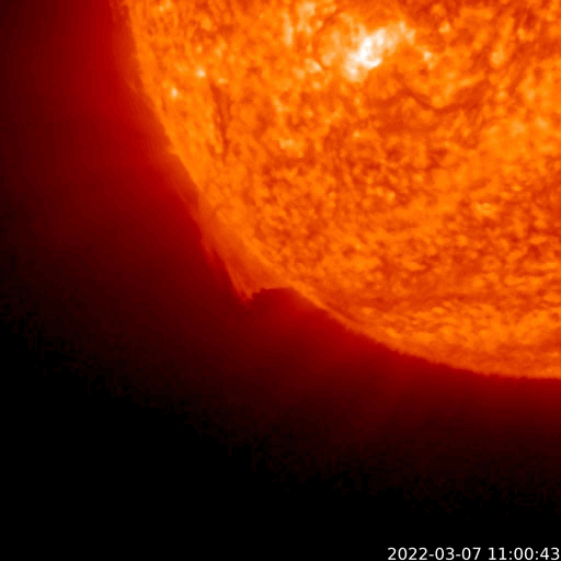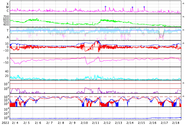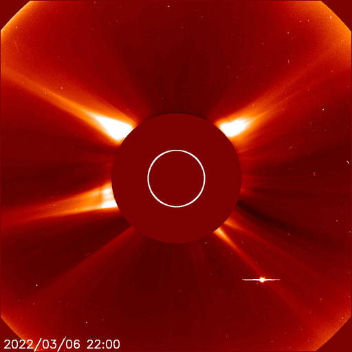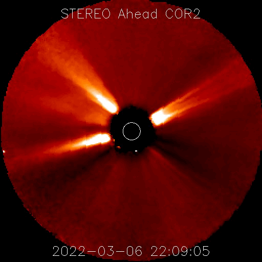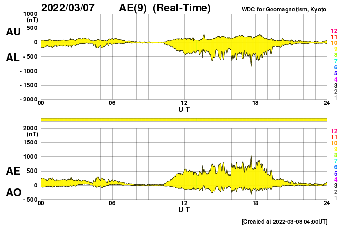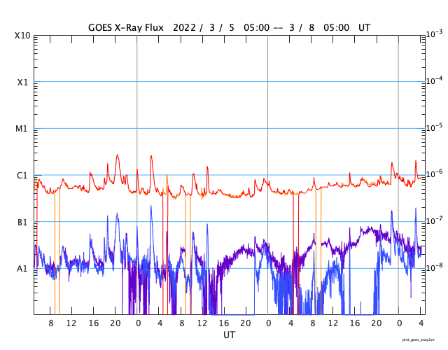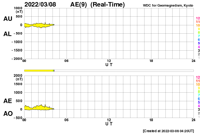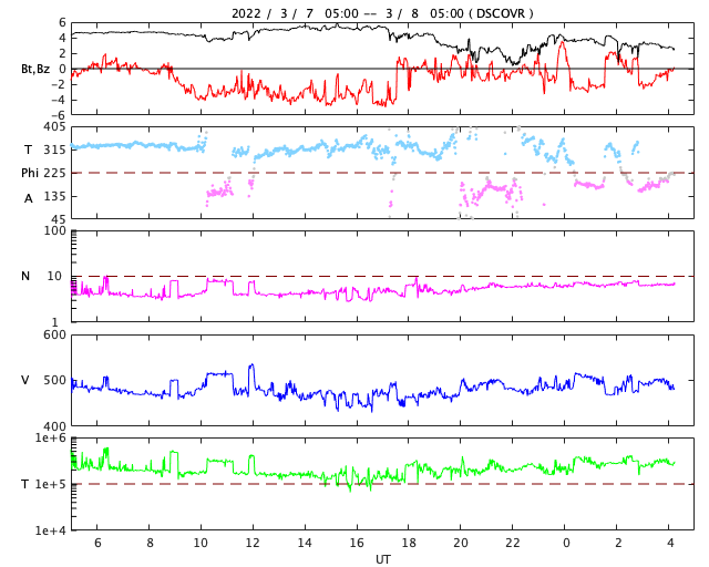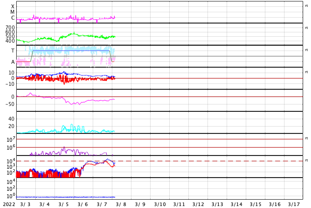 2022/ 3/ 8 13:23 更新 太陽風は高速の状態です。磁気圏は活動的になりました。 担当 篠原 昨日のニュースで紹介した 太陽の北西(右上)の小さいフレアに関係する CME(コロナ質量放出)の様子を、 SOHO衛星LASCO C2、C3と、 STEREO Ahead衛星COR2の2つの動画で紹介します。 SOHO衛星では、かなり淡いですが 右上に向かってガスが飛び出す様子が見えます。 STEREO Ahead衛星は地球よりも左横から撮影しているので、 CMEは、より見やすく写っています。 噴出としては小規模ですし、地球に対して斜め方向ですが、 2〜3日後くらいに太陽風磁場の強まりが見られるかもしれません。 太陽は、北東の端(左上)でC1.8、C2.0の 小規模フレアが発生しています。 活動的な領域が近づいている様です。 どの様な領域が現れるか注目してください。 また、昨夜から今日未明にかけて、太陽の南東の端(左下)で プロミネンスの噴出が発生しています。 GOES衛星SUVI 304の動画を掲載します。 なかなか見事な噴出です。 真横で発生しているので、地球への影響はありません。 太陽風は、昨夜にかけて470km/秒へ速度が少し下がりましたが、 今朝以降再び上昇して、現在は500km/秒と高速の状態に戻っています。 磁場強度は、5nTから3nTへ少し下がり、やや弱くなっています。 コロナホールの影響がまだ続いている様です。 現在のSDO衛星AIA193では、コロナホールは見えなくなっています。 この後、太陽風の速度は低下に向かいそうです。 磁場の南北成分は、グラフの中盤で南向きにやや強まり、 AE指数は、500〜1000nTの中規模の変化がしばらく続きました。 その後は穏やかになっています。 高速太陽風の影響で、放射線帯の高エネルギー電子が増加し、 GOES衛星の観測が1万に達しています。