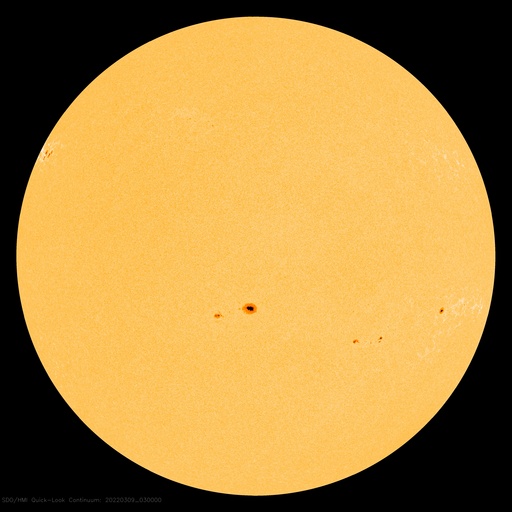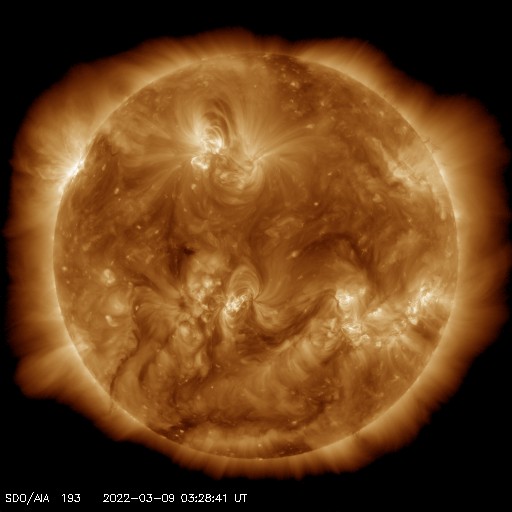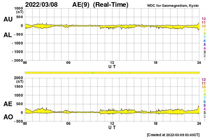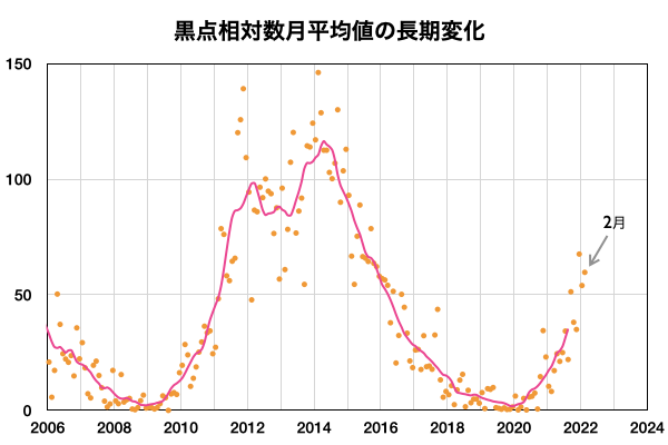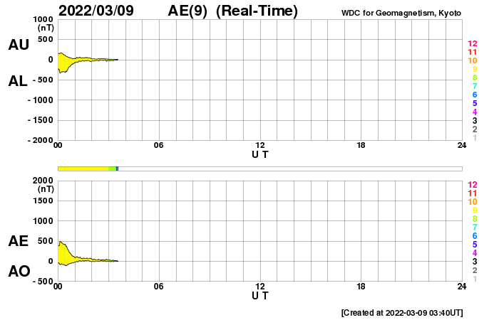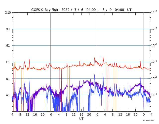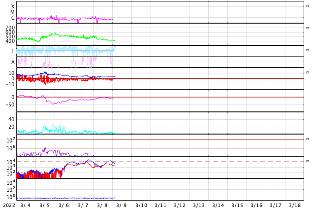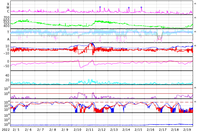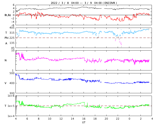 2022/ 3/ 9 12:49 更新 太陽風は平均的な状態です。2月の黒点相対数は 59.7 でした。 担当 篠原 WDC-SILSOより、 2月の黒点相対数は、59.7 と発表されました。 12月から3か月連続で50を超えていて、 既にこの水準が当たり前になっている様です。 1枚目の図で11年前の2011年の初め頃を見ると、 13か月平均値の赤線は、ちょうど50の線に達しています。 今周期の太陽黒点は、 前周期と同じ様な立ち上がりが続いています。 そう考えると、2012年の後半では、 月平均値の点は100を超えるくらいに高まっています。 半年後には、太陽黒点の出現数がこのくらい (現在の2倍です)に高まっている可能性があります。 11年に1度しか見られない黒点数の高まりの変化です。 注目してください。 太陽の北東の端(左上)には、2965黒点群が現れています。 小さい活動が続いていて、 今朝、9日7時半(世界時8日22時半)には、 C1.1の小規模フレアを起こしています。 引き続き注目してください。 太陽風は、昨日のニュースのすぐ後に速度が450km/秒へ下がり、 現在は400km/秒と平均的な速度に戻っています。 磁場強度は、4nTと平均的な状態です。 磁場の南北成分は、弱い南寄りになっていて、 AE指数は、小さい変化が続いています。 太陽風の速度が下がってきたので、 この後の活動はより小さくなるでしょう。 SDO衛星AIA193では、 太陽の東側にかけてコロナホールは見えていません。 27日前には、太陽の中心部の南側にコロナホールがあり、 27日周期の図の前周期の 2月12日以降の高速太陽風を作っていたのですが、 今回の太陽風はこのまま穏やかに推移しそうです。 放射線帯の高エネルギー電子は、高まった状態が続いています。 太陽風速度の高まりは終わっているので、 この後はゆっくりと減少するでしょう。