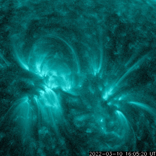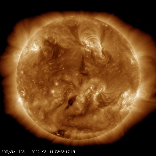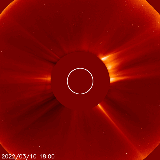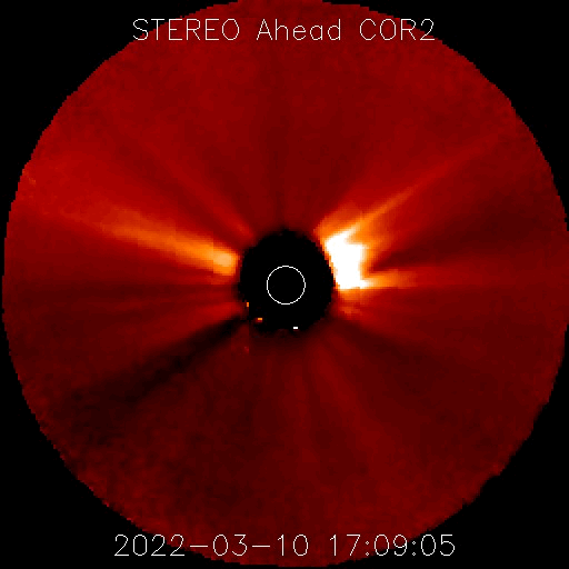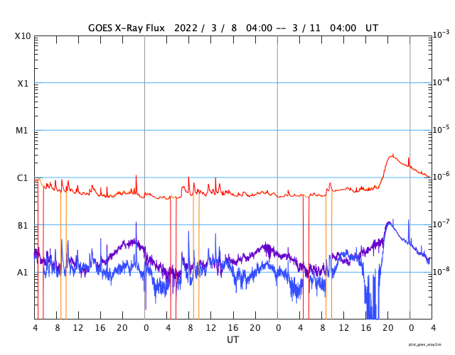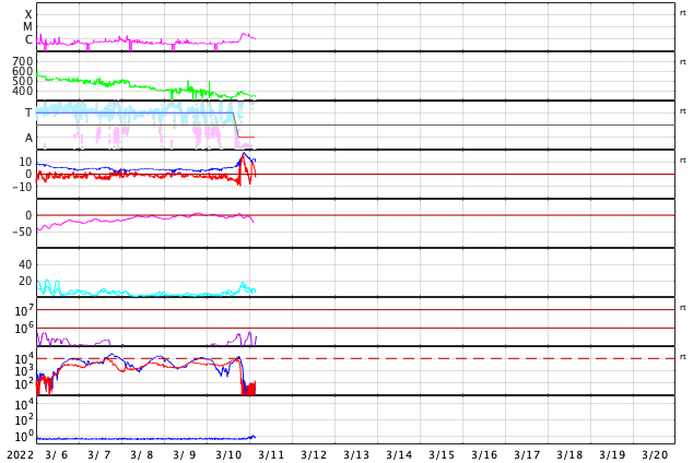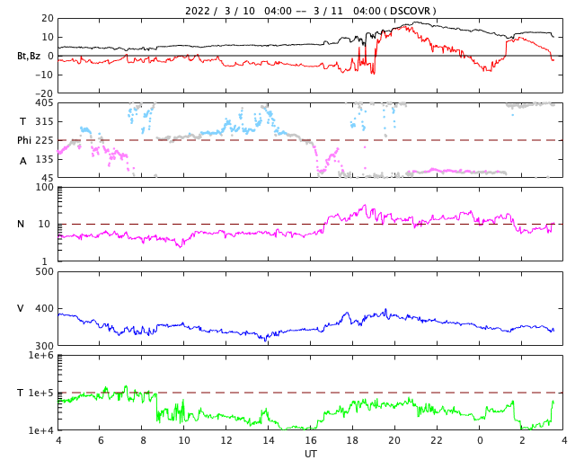 2022/ 3/11 12:50 更新 太陽の中心部でCMEが発生し、太陽風の乱れが地球へ向かっています。太陽風磁場が強まっています。 担当 篠原 今日未明、11日3時(世界時10日18時)に、 太陽の中心部北側の2962黒点群で、 C2.8の小規模フレアが発生しました。 SDO衛星AIA131、171、193による動画を掲載します。 フレアの瞬間はAIA131(青)がぼんやりと明るくなる程度で、 ほとんど目立たないのですが、 その後のポストフレアループが、 特にAIA171(黄)できれいに見えています。 AIA193(茶)の画像では、 コロナの動きが大きい様には見えないのですが、 SOHO衛星LASCO C2、C3では、 太陽を囲む様に広がっていくハロー型のCME(コロナ質量放出)が 観測されています。 太陽を左斜めから観測しているSTEREO Ahead衛星のCOR2でも、 右横方向にCMEが飛び出す様子が撮影されています。 発生場所とCMEの広がりの様子から、 太陽風の乱れが地球へ到来することは確実でしょう。 現在の太陽風の速度から、地球まで4日前後かかると考えると、 14日から16日にかけて乱れの到来に注目してください。 フレアの規模は小さいので、速度は特に高まらず、 磁場や密度の変化が発生する可能性があります。 磁場の強まりが南向きになると、磁気圏の活動が活発になり、 激しいオーロラや磁気嵐などが発生します。 速度が高まらなかった場合は、 磁気圏の乱れの規模は強まりにくくなりますが、 乱れの継続時間がより長くなる可能性があります。 来週の前半に注目してください。 太陽風は、350km/秒前後の低速の状態になっています。 今日未明から磁場が強まり始め、 5nTと平均的な状態から、今朝早くには18nTまで強まりました。 その後は少し下がりましたが、現在も12nTに強まった状態です。 7日のニュースでお知らせした 太陽の北西側で発生した小さいフレアの時に飛び出したCMEの乱れが 到来した可能性があります。 磁場の南北成分は、 磁場が強まり始める頃までは南寄りの傾向が続き、 AE指数で500nTから1200nTに達する大きな変化が発生しています。 しかし、磁場が強まった頃からは北向きに変化する様になり、 磁気圏の活動は弱くなっています。 今後、南向きに傾向が変われば、磁気圏の活動も強まるでしょう。 磁場の強まりが終わるまでは注意して下さい。 放射線帯の高エネルギー電子は、 磁気圏活動の高まりに関係して、大きく減少しています。 ![]() 2962黒点群で発生したC2.8の小規模フレア。SDO衛星AIA131、171、193。 (c) SDO (NASA)、(動画加工 : 宇宙天気ニュース) ![]() 太陽を囲む様にCMEが広がっています。SOHO衛星LASCO C2、C3。 (c) SOHO (ESA & NASA)、 (動画加工 : 宇宙天気ニュース) ![]() STEREO Ahead衛星COR2によるCME。 (c) STEREO (NASA)、 (動画加工 : 宇宙天気ニュース) ![]() SDO衛星のAIA193カメラによる太陽コロナの様子 (c) SDO (NASA) ![]() SDO衛星による太陽の可視光写真。マウスの矢印を写真に重ねると、黒点番号付きの写真に切り替わります。 (c) SDO (NASA) ![]() GOES衛星の太陽X線強度。赤・橙 = 0.1〜0.8 nm、青・紫 = 0.05〜0.4 nm (c) データ:NOAA/SWPC、作図:宇宙天気ニュース ![]() DSCOVRが観測した太陽風の磁場(黒線は全体の強度、赤線は南北成分) 磁場の向き、プラズマの密度、速度、温度 (c) データ:NOAA/SWPC、作図:宇宙天気ニュース ![]() AE指数(速報値) 下段のAEグラフの値が高くなると、オーロラ活動が活発化しています。 (c) 京都大学WDC ![]() ![]() 27日の太陽周期に合わせた図 太陽が同じ面を地球に向けていた27日前の変化から、今後を予想することができます。 (c) 作図:宇宙天気ニュース