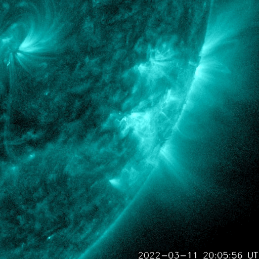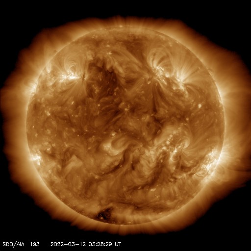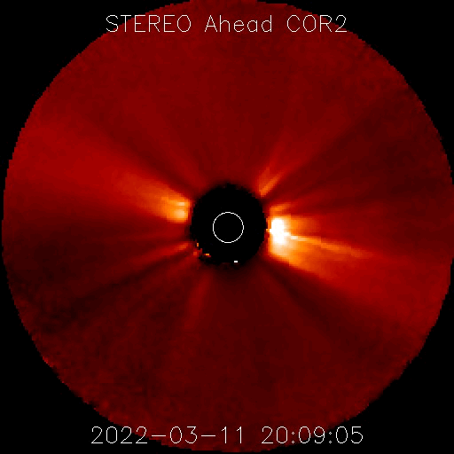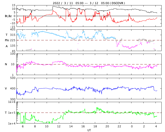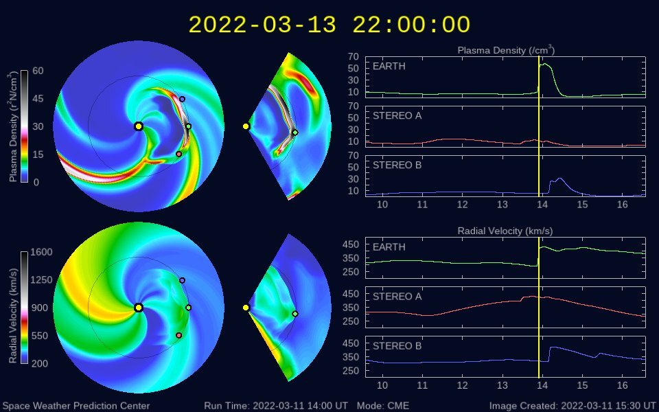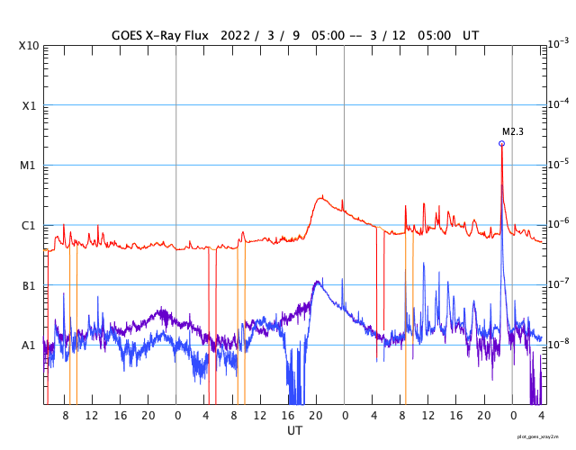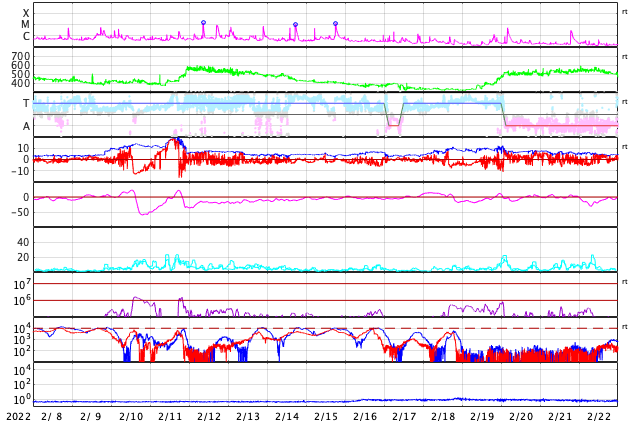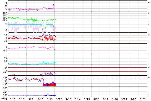 2022/ 3/12 13:25 更新 M2.2の中規模フレアが発生しました。太陽風磁場の強まりが続き、磁気圏活動も活発でした。 担当 篠原 今朝、12日7時(世界時11日22時)に、 太陽の南西(右下)の2964黒点群で、 M2.2の中規模フレアが発生しました。 Mクラスのフレアの発生は、 世界時3月2日のM2.0以来で、10日ぶりです。 SDO衛星AIA131の動画を掲載します。 STEREO Ahead衛星によると、 このフレアに伴ってCME(コロナ質量放出)も発生していて、 COR2の動画を見ると、 太陽の右下に向かってコロナのガスが飛び出しています。 発生地点が南西の端に近いので、 地球に対しては斜めの噴出となり、 影響は比較的小さいものになりそうです。 一方、昨日のCMEの到来時刻について、 NOAA/SWPCの予報が発表されました(3枚目の図)。 14日7時(世界時13日22時)頃になる可能性があるとのことで、 発生から3日と少しくらいでの到来と考えている様です。 太陽風の速度は450km/秒近くと、特に高まることはない様です。 磁場の強まりがやって来て、南向きに大きく変化すると、 オーロラなどの磁気圏の活動が強まります。 明後日は、太陽風や磁気圏の変化に注目してください。 太陽風は、速度は400km/秒前後と平均的な状態ですが、 昨夜、11日20時(世界時11日11時)に 磁場の強まりが再び到来しています。 ニュースではお知らせしていなかったのですが、 8日に太陽の北西側で小さいフレアが発生し、 CMEの噴出が起きていました。 この乱れが続いてやって来た様です。 磁場強度は、今朝まで10nT近い強まりが続き、 -5〜 -10nTの南向きの変化が繰り返しやって来ました。 磁気圏の活動は強まった状態が続き、 AE指数では500〜1000nTの中規模の変化が 繰り返し発生しています。 現在は、磁場強度は5nTと平均的な状態に下がっています。 南向きは続いていますが、 磁気圏の活動は規模が小さくなりそうです。