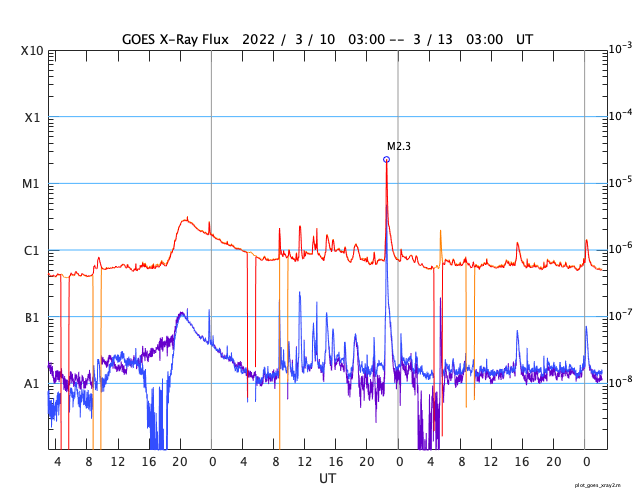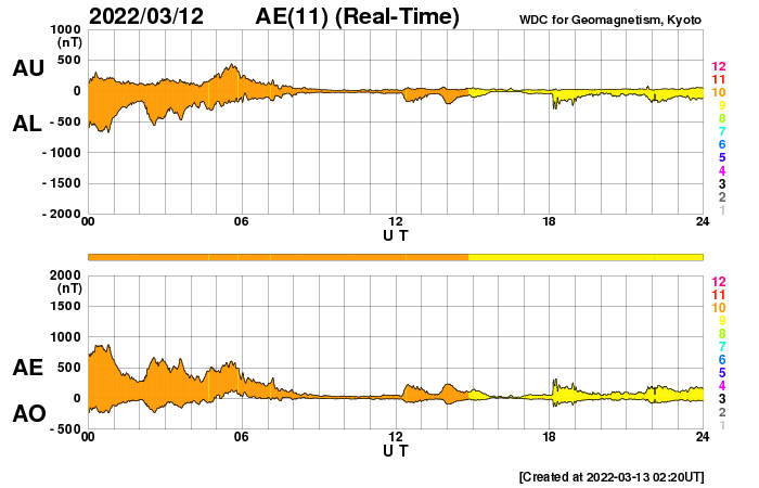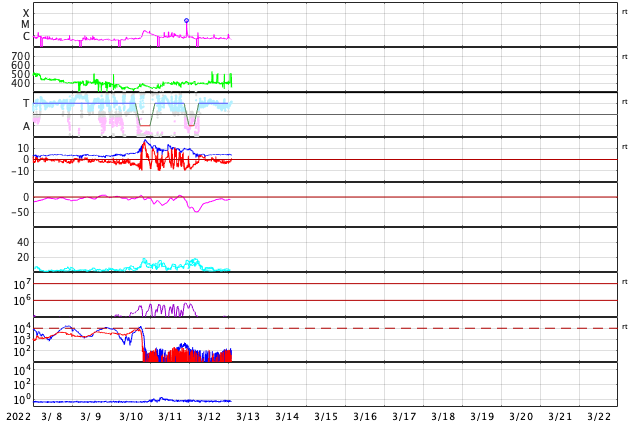 - 2022/ 3/12 13:25 M2.2の中規模フレアが発生しました。太陽風磁場の強まりが続き、磁気圏活動も活発でした。