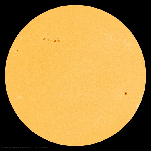 SDO衛星による太陽の可視光写真。マウスの矢印を写真に重ねると、黒点番号付きの写真に切り替わります。