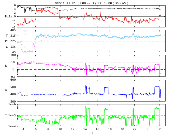 - 2022/ 3/ 8 13:23 太陽風は高速の状態です。磁気圏は活動的になりました。