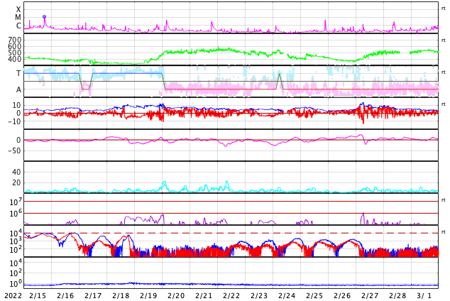 磁場の南北成分は、弱い南寄りで推移しています。