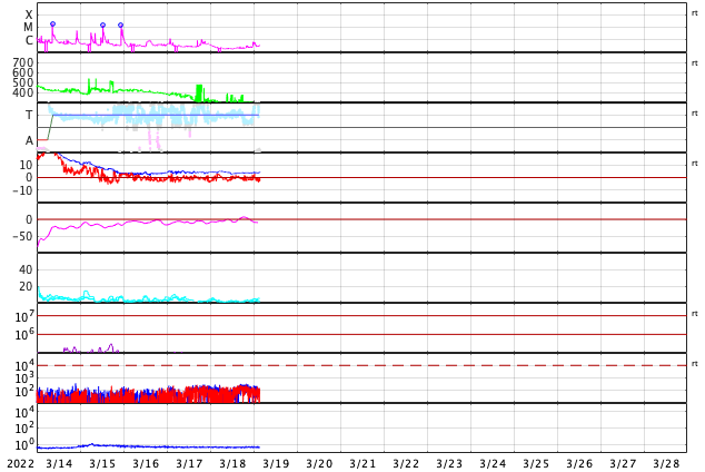 2022/ 3/16 12:59 Mフレアが2回発生しています。太陽風は平均的な状態です。