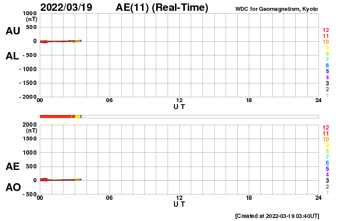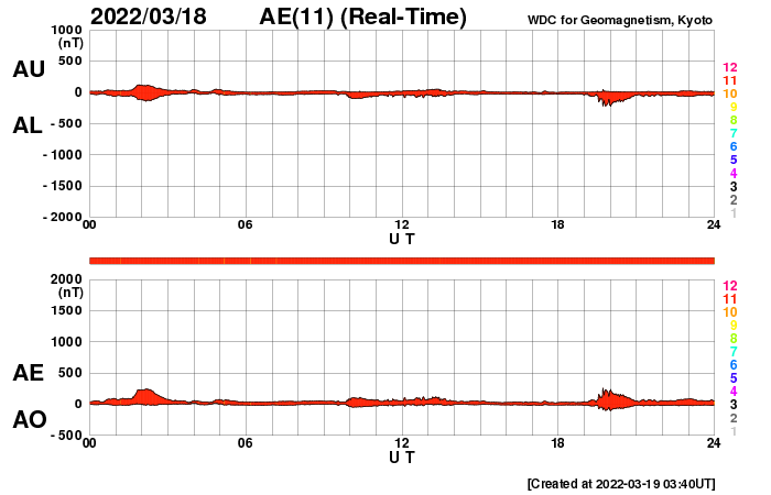 下段のAEグラフの値が高くなると、オーロラ活動が活発化しています。