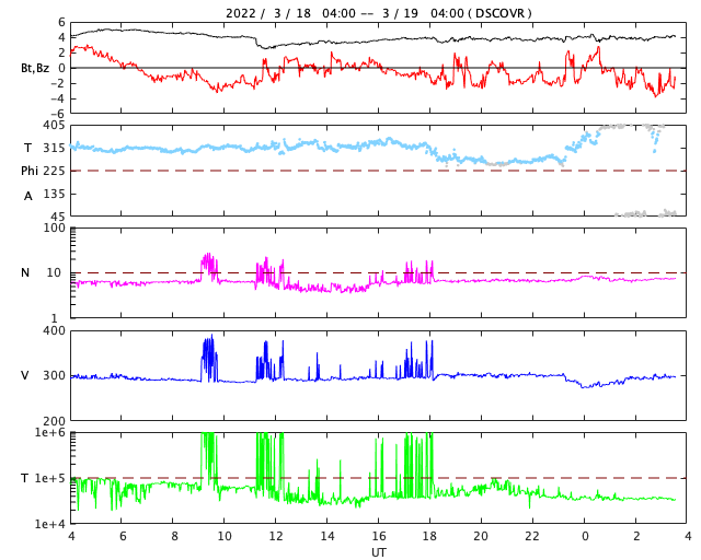 2022/ 3/18 13:30 太陽風は低速になっています。太陽は穏やかです。