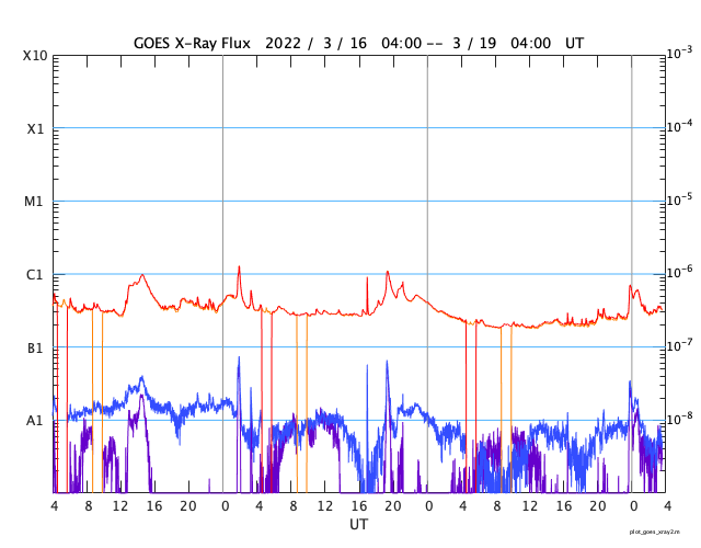 GOES衛星の太陽X線強度。赤・橙 = 0.1〜0.8 nm、青・紫 = 0.05〜0.4 nm