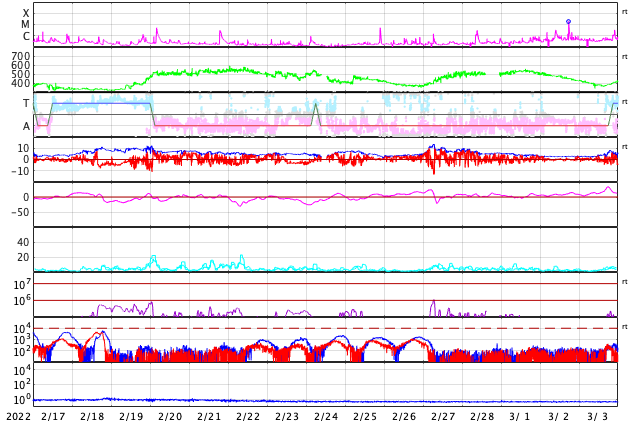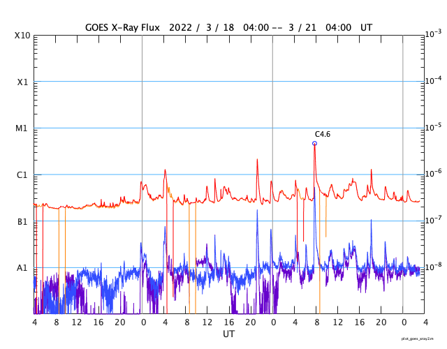 GOES衛星の太陽X線強度。赤・橙 = 0.1〜0.8 nm、青・紫 = 0.05〜0.4 nm (c) データ:NOAA/SWPC、作図:宇宙天気ニュース ![]() | |||||||||||||||||||||||||||||||||||||||||||||||||||||||||||||||||||||||||||||||||||||||||||||||||||||||||||||||||||||||||||||||||||||||||||||||||||||||||||||||||||||||||||||||||||||||||||||||||||||||||||||||||||||||||