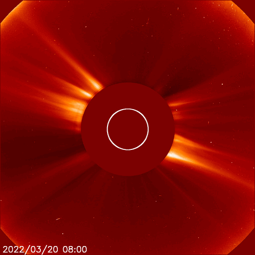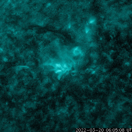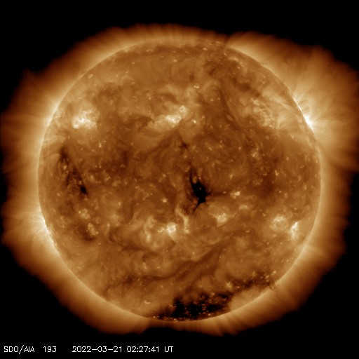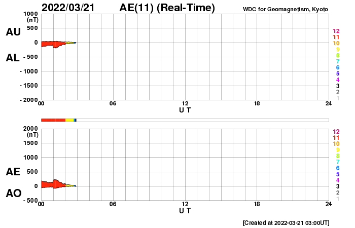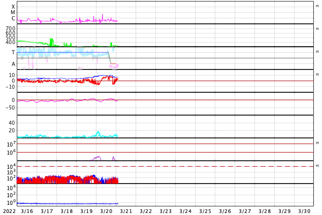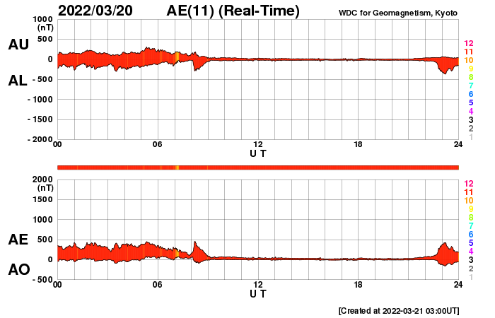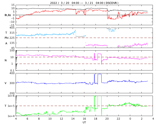 2022/ 3/21 12:18 更新 太陽風は低速の状態が続いています。磁気圏は穏やかです。 担当 篠原 太陽風は、320km/秒と低速の風が続いています。 磁場強度は10nTに強まっていましたが、 今朝早くに一段下がり、 現在は6nTと平均的な値に戻っています。 太陽風磁場の南北成分は、 南向きから北向きにゆっくり切り替わっています。 このため磁気圏の活動は静かになり、 AE指数は途中から変化がなくなっています。 グラフの最後の高まりは、 太陽風のグラフの後半の一時的な南向きの影響です。 SDO衛星AIA193の南半球のコロナホールは更に西に進んでいて、 速度の高まりは来ないままになりそうです。 一方、中心部に小さいコロナホールがあるので、 2〜3日後に速度の弱い高まりが見られるかもしれません。 太陽は、昨日の午後、20日16時半(世界時20日7時半)に、 中心部北側の2971黒点群があった領域で C4.6の小規模フレアが発生しています。 SDO衛星AIA131、193の動画を掲載します。 AIA193(茶色)の動画では、 コロナが周囲に噴き出す様子が見えています。 SOHO衛星LASCO C2、C3によると、 淡いCME(コロナ質量放出)が太陽の左寄りに発生しています。 発生地点が中心線に近いので、 太陽風の乱れは地球にも到来する可能性があります。 4日程度かかると考えると、 24〜25日頃の太陽風に磁場の強まりが見られる可能性があります。 太陽は、小さい黒点ばかりになっています。 ![]() 2971群の領域で発生したC4.6の小規模フレア。SDO衛星AIA131、193。 (c) SDO (NASA)、(動画加工 : 宇宙天気ニュース) ![]() C4.6フレアに伴って発生したCME。SOHO衛星LASCO C2、C3。 (c) SOHO (ESA & NASA)、 (動画加工 : 宇宙天気ニュース) ![]() SDO衛星のAIA193カメラによる太陽コロナの様子 (c) SDO (NASA) ![]() SDO衛星による太陽の可視光写真。マウスの矢印を写真に重ねると、黒点番号付きの写真に切り替わります。 (c) SDO (NASA) ![]() DSCOVRが観測した太陽風の磁場(黒線は全体の強度、赤線は南北成分) 磁場の向き、プラズマの密度、速度、温度 (c) データ:NOAA/SWPC、作図:宇宙天気ニュース ![]() AE指数(速報値) 下段のAEグラフの値が高くなると、オーロラ活動が活発化しています。 (c) 京都大学WDC ![]() ![]() 27日の太陽周期に合わせた図 太陽が同じ面を地球に向けていた27日前の変化から、今後を予想することができます。 (c) 作図:宇宙天気ニュース