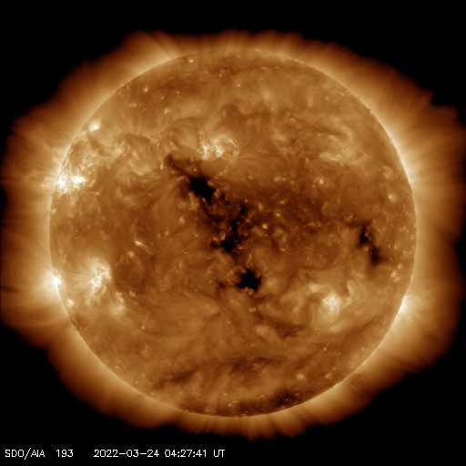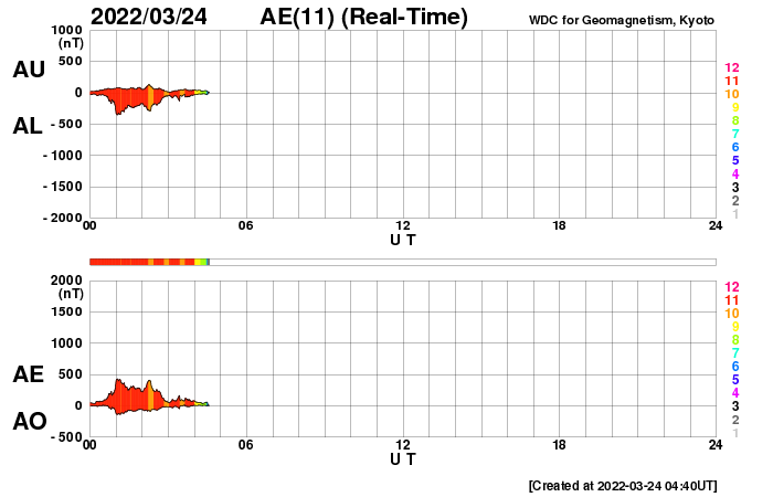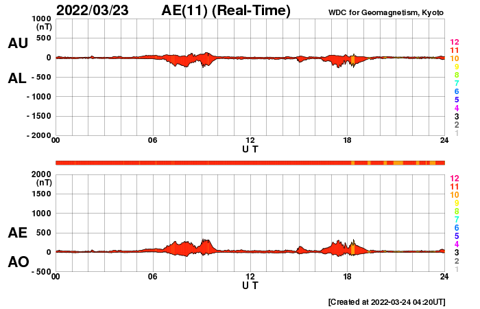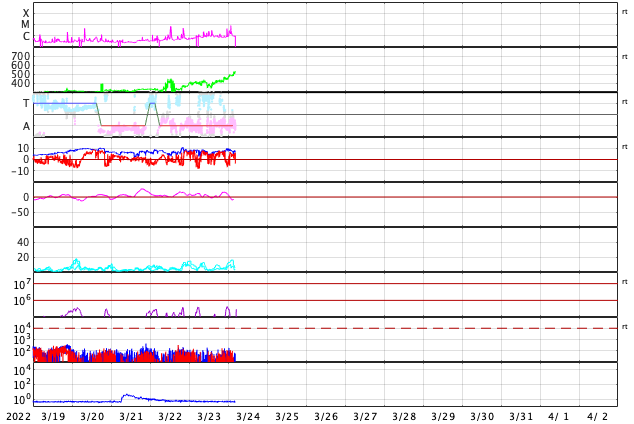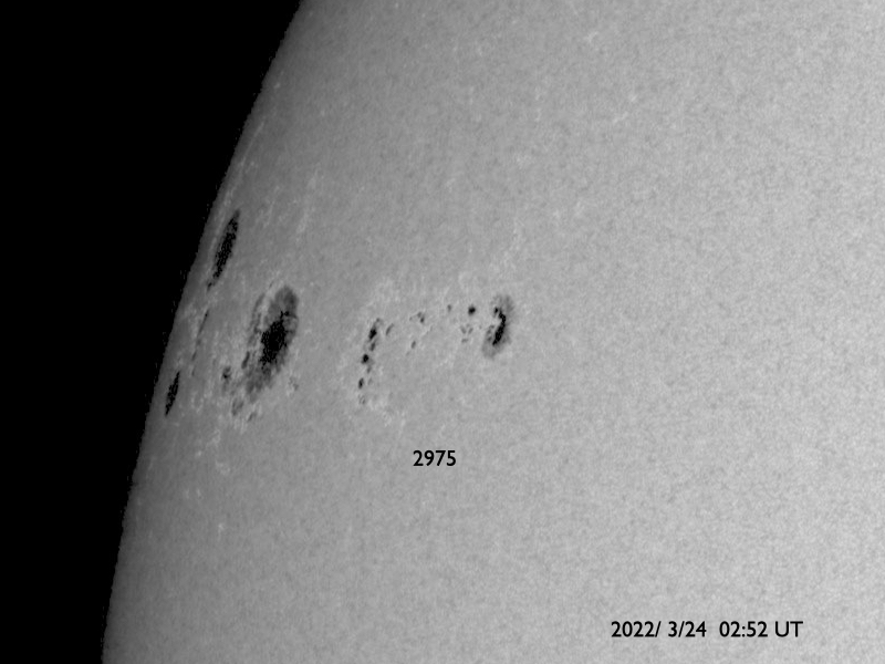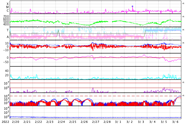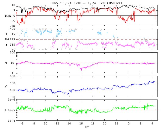 2022/ 3/24 13:45 更新 太陽風が高速になっています。太陽でCフレアが続いています。 担当 篠原 太陽風は、今日に入った頃から速度が上がり始め、 ちょうど500km/秒に達したところです。 コロナホールの影響が始まった様です。 磁場強度は5〜10nTの間を上下していて、 速度はさらに高まって行く可能性があります。 磁場の南北成分は、北寄りの傾向が続いています。 時々南を向いた時に磁気圏の活動が少し高まり、 AE指数で300nT程度の小規模の変化が発生しています。 速度が高まってきたので、 今後は、活動の規模がより大きくなりそうです。 SDO衛星AIA193の太陽コロナ写真では、 中心部にコロナホールが見えています。 3日後くらいにこの領域の影響が到来するので、 これからしばらく、 太陽風の速度は高まった状態が続くかもしれません。 太陽は、北東(左上)に黒点が並んで現れています。 SDO衛星の拡大写真を掲載します。 右側と左側で別の群に分かれている様で、 2975群という番号は右側の領域に付けられていると思います。 2975群でC8.1、C4.3、南東(左下)の2974群でC3.0、C2.5など、 小規模フレアが続いています。 今後の活動に注目して下さい。