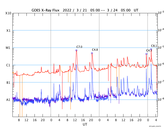 GOES衛星の太陽X線強度。赤・橙 = 0.1〜0.8 nm、青・紫 = 0.05〜0.4 nm (c) データ:NOAA/SWPC、作図:宇宙天気ニュース ![]() | |||||||||||||||||||||||||||||||||||||||||||||||||||||||||||||||||||||||||||||||||||||||||||||||||||||||||||||||||||||||||||||||||||||||||||||||||||||||||||||||||||||||||||||||||||||||||||||||||||||||||||||||||||||||||||||||||||||||||