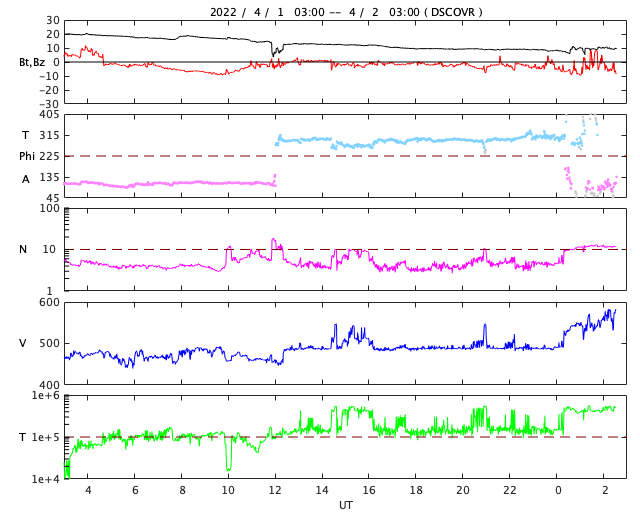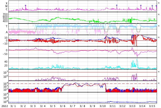 2022/ 3/28 13:11 太陽風は高速になり、磁気圏の活動も強まっています。
