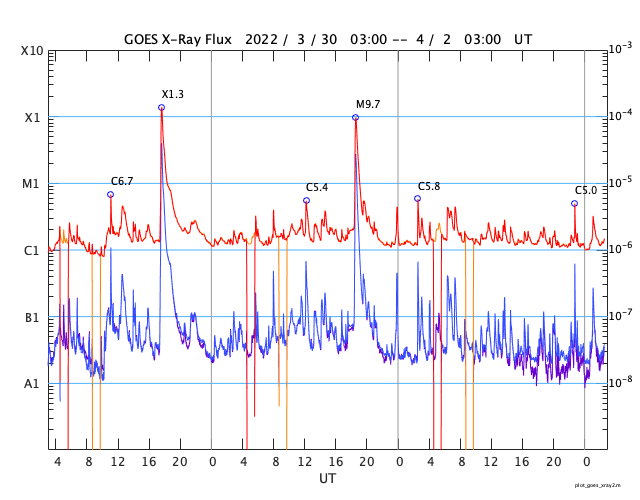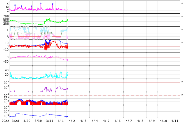 2022/ 4/ 1 13:25 太陽風の乱れは続いています。M9.6の中規模フレアが発生しました。