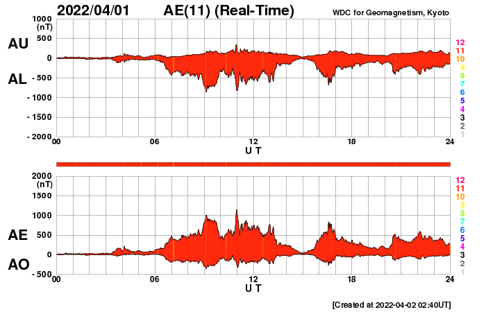下段のAEグラフの値が高くなると、オーロラ活動が活発化しています。