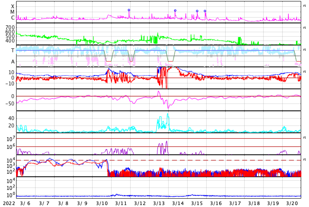 GOES衛星の太陽X線強度。赤・橙 = 0.1〜0.8 nm、青・紫 = 0.05〜0.4 nm (c) データ:NOAA/SWPC、作図:宇宙天気ニュース ![]() | |||||||||||||||||||||||||||||||||||||||||||||||||||||||||||||||||||||||||||||||||||||||||||||||||||||||||||||||||||||||||||||||||||||||||||||||||||||||||||||||||||||||||||||||||||||||||||||||||||||||||||||||||||||||||||||||